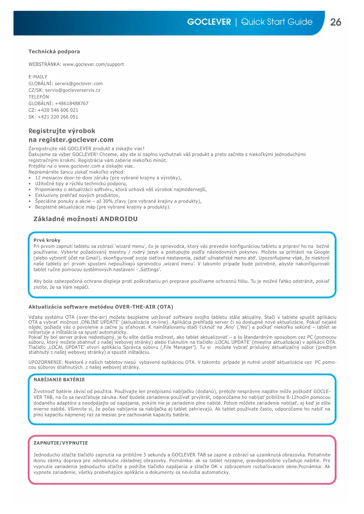 Životnosť batérie závisí od použitia. Používajte len predpísanú nabíjačku (dodanú), pretože nesprávne napätie môže poškodiť GOCLE- VER TAB, na čo sa nevzťahuje záruka. Keď budete zariadenie používať prvýkrát, odporúčame ho nabíjať približne 8-12hodín pomocou dodaného adaptéra a neodpájajte od napájania, pokým nie je zariadenie plne nabité. Potom môžete zariadenie nabíjať, aj keď je ešte mierne nabité. Všimnite si, že počas nabíjania sa nabíjačka aj tablet zahrievajú. Ak tablet používate často, odporúčame ho nabiť na plnú kapacitu najmenej raz za mesiac pre zachovanie kapacity batérie. Aktualizácia software metódou OVER-THE-AIR (OTA) Vďaka systému OTA (over-the-air) možete bezplatne udržovať software svojho tabletu stále aktuálny. Stačí v tablete spustit aplikáciu OTA a vybrať možnost ‚ONLINE UPDATE’ (aktualizácia on-line). Aplikácia prehľadá server či sú dostupné nové aktualizácie. Pokiaľ nejaké nájde, požiada vás o povolenie a začne ju sťahovat. K nainštalovaniu stačí ťuknúť na ‚Ano’ (‚Yes‘) a počkať niekoľko sekúnd – tablet se reštartuje a inštalácia sa spustí automaticky. Pokiaľ by bol server práve nedostupný, je tu ešte dalšia možnost, ako tablet aktualizovať – a to štandardným sposobom cez PC (pomocou súboru, ktorý možete stiahnuť z našej webovej stránky) alebo ťuknutím na tlačidlo ‚LOCAL UPDATE’ (miestna aktualizácia) v aplikácii OTA. Tlačidlo ‚LOCAL UPDATE’ otvorí aplikáciu Správca súboru (‚File Manager’). Tu si možete vybrať príslušný aktualizačný súbor (predtým stiahnutý z našej webovej stránky) a spustit inštaláciu. UPOZORNENIE: Niektoré z našich tabletov niesú vybavené aplikáciou OTA. V takomto prípade je nutné urobiť aktualizácie cez PC pomo- cou súborov stiahnutých z našej webovej stránky. ZAPNUTIE/VYPNUTIE Jednoducho stlačte tlačidlo zapnutia na približne 3 sekundy a GOCLEVER TAB sa zapne a zobrazí sa uzamknutá obrazovka. Potiahnite ikonu zámky doprava pre odomknutie základnej obrazovky. Poznámka: ak sa tablet nezapne, pravdepodobne vyžaduje nabitie. Pre vypnutie zariadenia jednoducho stlačte a podržte tlačidlo napájania a stlačte OK v zobrazenom rozbaľovacom okne.Poznámka: Ak vypnete zariadenie, všetky prebiehajúce aplikácie a dokumenty sa neuložia automaticky.