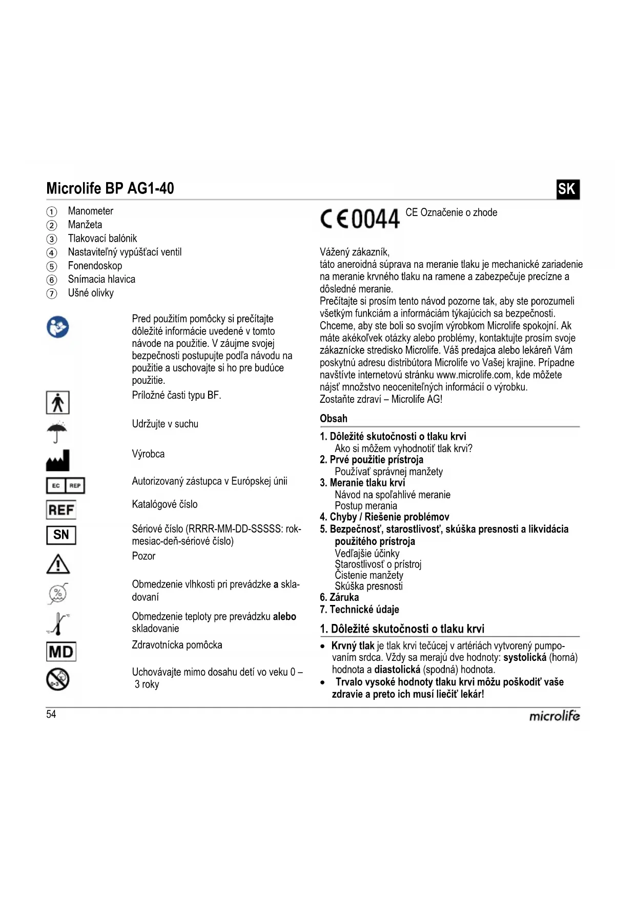 likvidácia použitého prístroja Postupujte podľa návodu na použitie. Tento návod obsahuje dôležité informácie o prevádzke a bezpečnosti tohto prístroja. Pred používaním prístroja si dôkladne prečítajte tento návod a uschovajte ho na ďalšie použitie. Tento prístroj sa môže používať iba na účely popísané v tomto návode. Výrobca nenesie zodpovednosť za škody spôsobené nesprávnym použitím. Tento prístroj obsahuje citlivé súčiastky, preto je potrebné s ním zaobchádzať opatrne. Dodržujte podmienky skladovania a prevádzky popísané v kapitole «Technické údaje»! Manžety sú citlivé na použitie. Manžetu nafukujte iba vtedy, keď je nasadená na ramene. Nikdy manžetu nenafukujte nad 300 mmHg. Pred uskladnením prístroja manžetu úplne vypustite. Nepoužívajte prístroj, ak si myslíte, že je poškodený alebo ak na ňom spozorujete niečo nezvyčajné. Prečítajte si dodatočné bezpečnostné pokyny v samostatných kapitolách tohto návodu. Výsledok merania daný týmto prístrojom nie je diagnóza. Neslúži ako náhrada konzultácie s lekárom, najmä ak sa nezho- duje s príznakmi pacienta. Nespoliehajte sa iba na výsledok merania, vždy zvážte aj ďalšie potenciálne symptómy a pacien- tovu spätnú väzbu. V prípade potreby sa odporúča zavolať lekárovi. Aby ste sa vyhli nepresným meraniam alebo poraneniam, pomôcku nepoužívajte, ak stav pacienta spĺňa niektorú z nasledujúcich indikácií. Nepoužívajte pomôcku v pohybujúcom sa dopravnom prostriedku (napríklad v aute alebo v lietadle). Kontraindikované na použitie u novorodenca. Nepoužívajte s novorodeneckými manžetami alebo u novorodeneckých pacientov. Tlakomer na princípe kovového vzduchového merania tlaku vyžaduje častú opätovnú kalibráciu (aspoň každých 6 mesiacov). Aby ste sa vyhli pozorovanej chybe, vyžaduje sa odbornosť a opakované školenie. Pomáha to používateľovi zaznamenať Korotkovove fenomény pomocou auskultačného fonendoskopu. Okolitý hluk môže narušovať merania a údaje pomôcky. Vyžaduje zručnosť, aby sa zaistila správna rýchlosť vyfúknutia manžety. Na presné merania je potrebný výborný sluch a zrak. Vedľajšie účinky Použitie pomôcky môže byť spojené s nezávažnými vedľajšími účinkami Ak dôjde k stlačeniu pomôcky alebo nárazu do nej, môže sa stratiť kalibrácia (pomôcka bude nepresná), čo vedie k falošným údajom pomôcky. Vyšetrujúci môžu byť zaujatý a preferovať konečnú číslicu, čo vedie k nepresným údajom pomôcky. Starostlivosť o prístroj Prístroj čistite iba mäkkou suchou handričkou. Čistenie manžety Škvrny z manžety odstraňujte kúskom tkaniny namočenej do mydlovej vody. Skúška presnosti Odporúčame nechať si tento prístroj preskúšať na presnosť každé 2 roky alebo po mechanickom náraze (napr. po páde). Kontaktujte prosím svoje servisné stredisko Microlife, aby Vám zabezpečilo preskúšanie (pozrite úvod).