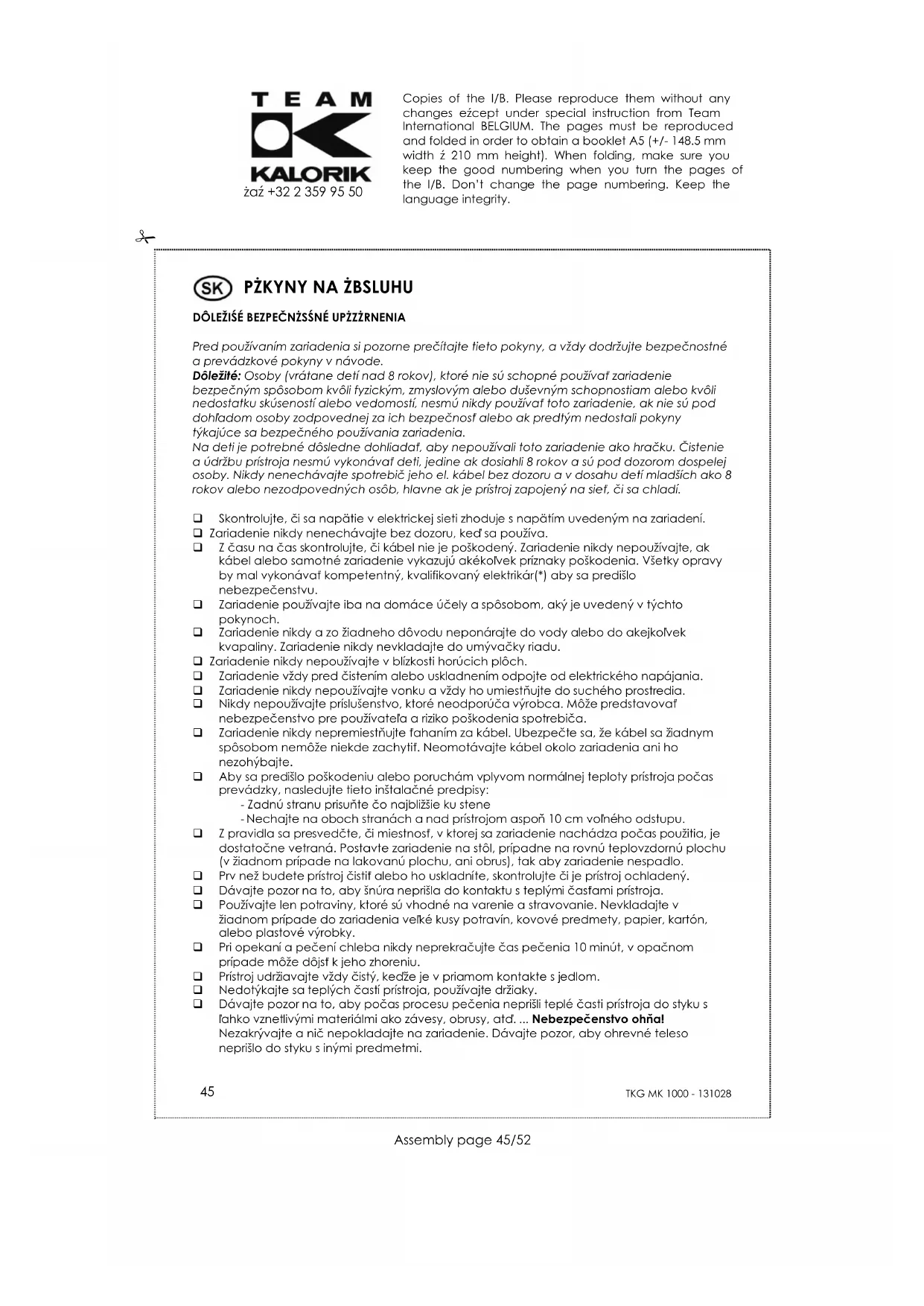 Pred používaním zariadenia si pozorne prečítajte tieto pokyny, a vždy dodržujte bezpečnostné a prevádzkové pokyny v návode. Dôležité: Osoby (vrátane detí nad 8 rokov), ktoré nie sú schopné používať zariadenie bezpečným spôsobom kvôli fyzickým, zmyslovým alebo duševným schopnostiam alebo kvôli nedostatku skúseností alebo vedomostí, nesmú nikdy používať toto zariadenie, ak nie sú pod dohľadom osoby zodpovednej za ich bezpečnosť alebo ak predtým nedostali pokyny týkajúce sa bezpečného používania zariadenia. Na deti je potrebné dôsledne dohliadať, aby nepoužívali toto zariadenie ako hračku. Čistenie a údržbu prístroja nesmú vykonávať deti, jedine ak dosiahli 8 rokov a sú pod dozorom dospelej osoby. Nikdy nenechávajte spotrebič jeho el. kábel bez dozoru a v dosahu detí mladších ako 8 rokov alebo nezodpovedných osôb, hlavne ak je prístroj zapojený na sieť, či sa chladí. Skontrolujte, či sa napätie v elektrickej sieti zhoduje s napätím uvedeným na zariadení. Zariadenie nikdy nenechávajte bez dozoru, keď sa používa. Z času na čas skontrolujte, či kábel nie je poškodený. Zariadenie nikdy nepoužívajte, ak kábel alebo samotné zariadenie vykazujú akékoľvek príznaky poškodenia. Všetky opravy by mal vykonávať kompetentný, kvalifikovaný elektrikár(*) aby sa predišlo nebezpečenstvu. Zariadenie používajte iba na domáce účely a spôsobom, aký je uvedený v týchto pokynoch. Zariadenie nikdy a zo žiadneho dôvodu neponárajte do vody alebo do akejkoľvek kvapaliny. Zariadenie nikdy nevkladajte do umývačky riadu. Zariadenie nikdy nepoužívajte v blízkosti horúcich plôch. Zariadenie vždy pred čistením alebo uskladnením odpojte od elektrického napájania. Zariadenie nikdy nepoužívajte vonku a vždy ho umiestňujte do suchého prostredia. Nikdy nepoužívajte príslušenstvo, ktoré neodporúča výrobca. Môže predstavovať nebezpečenstvo pre používateľa a riziko poškodenia spotrebiča. Zariadenie nikdy nepremiestňujte ťahaním za kábel. Ubezpečte sa, že kábel sa žiadnym spôsobom nemôže niekde zachytiť. Neomotávajte kábel okolo zariadenia ani ho nezohýbajte. Aby sa predišlo poškodeniu alebo poruchám vplyvom normálnej teploty prístroja počas prevádzky, nasledujte tieto inštalačné predpisy: - Zadnú stranu prisuňte čo najbližšie ku stene - Nechajte na oboch stranách a nad prístrojom aspoň 10 cm voľného odstupu. Z pravidla sa presvedčte, či miestnosť, v ktorej sa zariadenie nachádza počas použitia, je dostatočne vetraná. Postavte zariadenie na stôl, prípadne na rovnú teplovzdornú plochu (v žiadnom prípade na lakovanú plochu, ani obrus), tak aby zariadenie nespadlo. Prv než budete prístroj čistiť alebo ho uskladníte, skontrolujte či je prístroj ochladený. Dávajte pozor na to, aby šnúra neprišla do kontaktu s teplými časťami prístroja. Používajte len potraviny, ktoré sú vhodné na varenie a stravovanie. Nevkladajte v žiadnom prípade do zariadenia veľké kusy potravín, kovové predmety, papier, kartón, alebo plastové výrobky. Pri opekaní a pečení chleba nikdy neprekračujte čas pečenia 10 minút, v opačnom prípade môže dôjsť k jeho zhoreniu. Prístroj udržiavajte vždy čistý, keďže je v priamom kontakte s jedlom. Nedotýkajte sa teplých častí prístroja, používajte držiaky. Dávajte pozor na to, aby počas procesu pečenia neprišli teplé časti prístroja do styku s ľahko vznetlivými materiálmi ako závesy, obrusy, atď. ... Nebezpečenstvo ohňa! Nezakrývajte a nič nepokladajte na zariadenie. Dávajte pozor, aby ohrevné teleso neprišlo do styku s inými predmetmi.