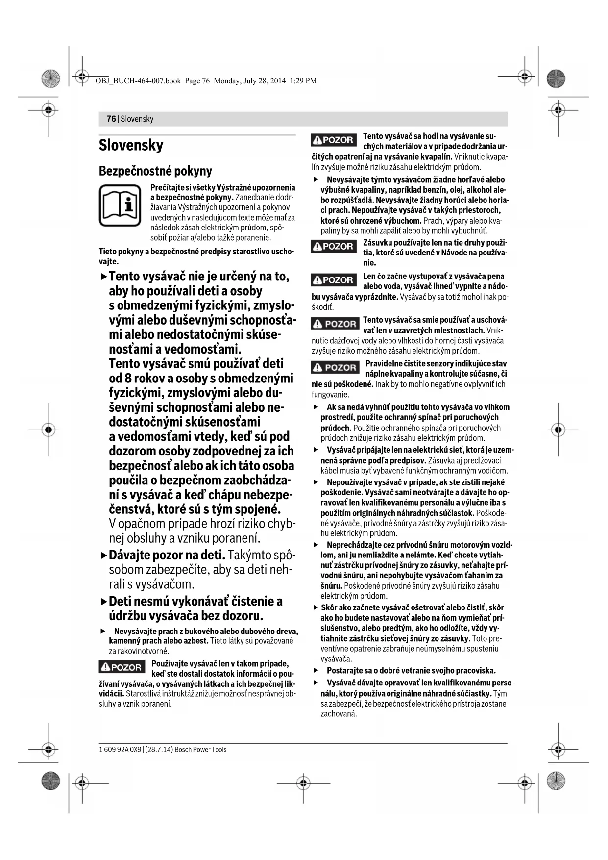 POZOR POZOR POZOR POZOR OBJ_BUCH-464-007.book Page 76 Monday, July 28, 2014 1:29 PMSlovensky | 77 Bosch Power Tools 1 609 92A 0X9 | (28.7.14) Vysávač obsahuje prach, ktorý ohrozuje