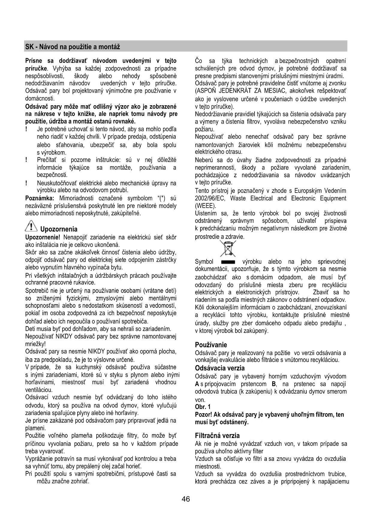 Prísne sa dodržiavať návodom uvedenými v tejto príručke. Vyhýba sa každej zodpovednosti za prípadne nespôsoblivosti, škody alebo nehody spôsobenė nedodržiavaním návodov uvedených v tejto príručke. Odsávač pary bol projektovaný výnimočne pre používanie v domácnosti.