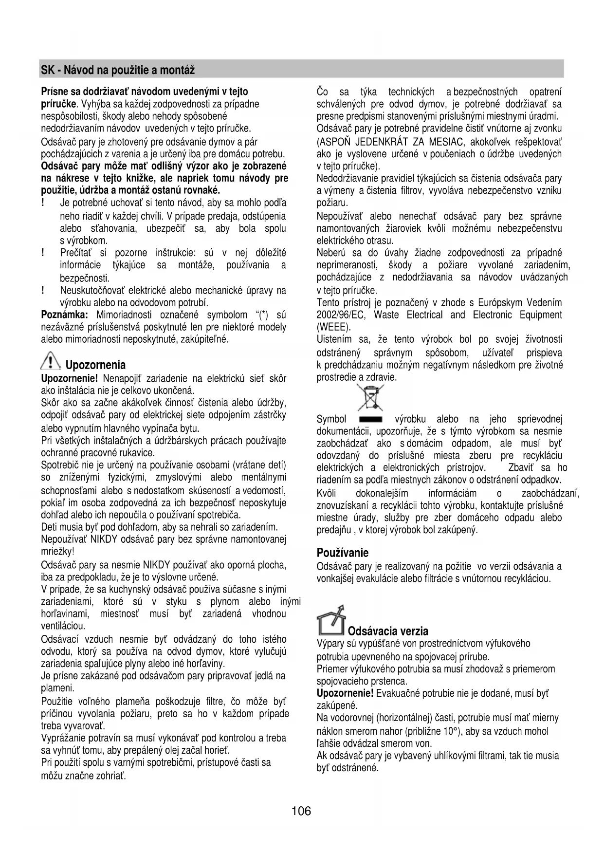 Odsávač pary sa nesmie NIKDY používať ako oporná plocha,