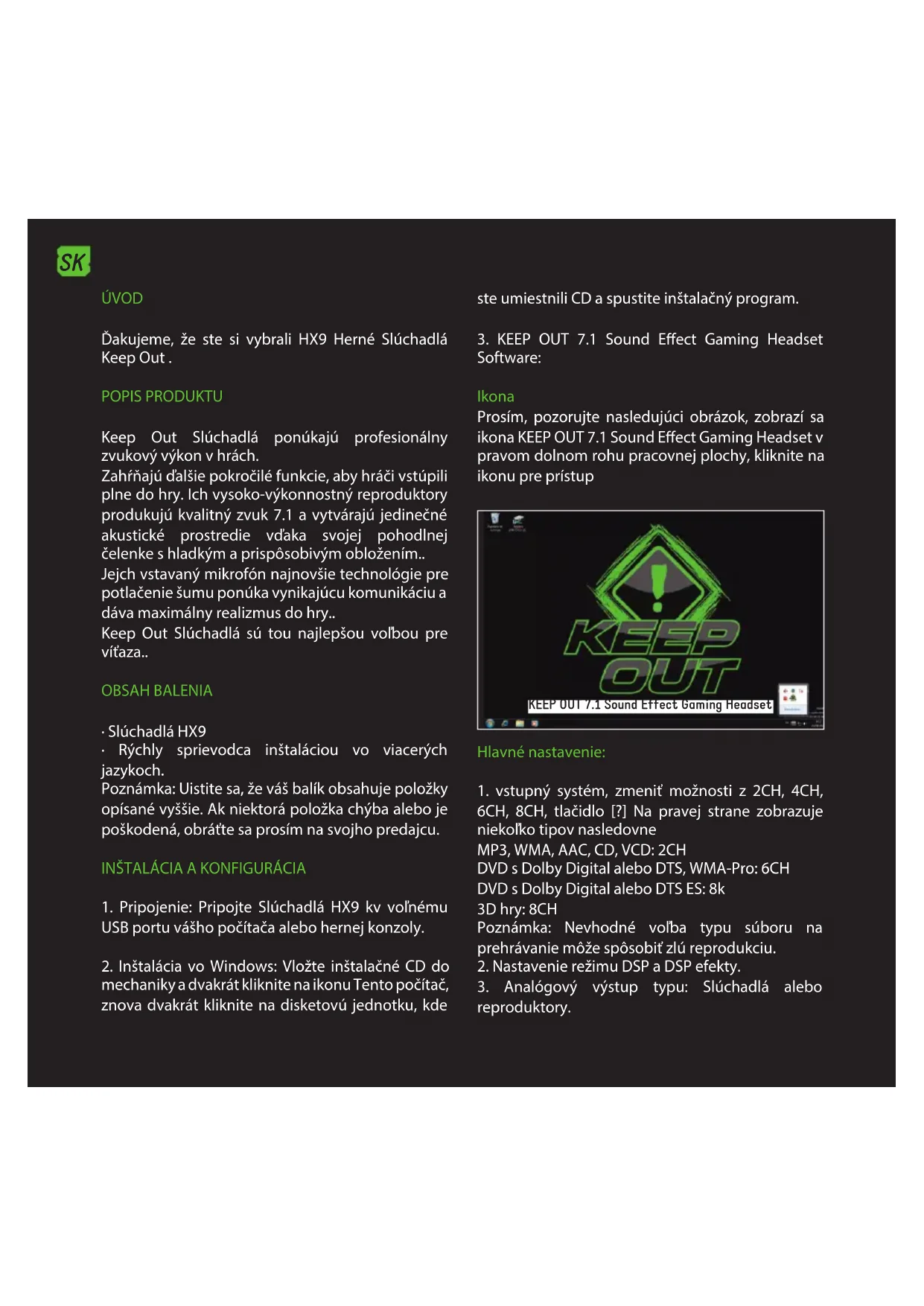 anulare. Informații Așează informații despre software-ul și vă permite să așați sau nu pictograma software-ul de pe desktop. KEEPOUT Virtual 7.1 CH Audio Device Ver: 1.0 Copyright © 2013, KEEPOUT URL: www.keep-out.eu SUPORT TEHNIC Pentru mai multe informații despre instalarea și congurarea acestui produs du-te la site-ul nostru www.keepout.eu sau scrie un e-mail la următoarea adresă: support@keep-out.eu.ÚVOD Ďakujeme, že ste si vybrali HX9 Herné Slúchadlá Keep Out . POPIS PRODUKTU Keep Out Slúchadlá ponúkajú profesionálny zvukový výkon v hrách. Zahŕňajú ďalšie pokročilé funkcie, aby hráči vstúpili plne do hry. Ich vysoko-výkonnostný reproduktory produkujú kvalitný zvuk 7.1 a vytvárajú jedinečné akustické prostredie vďaka svojej pohodlnej čelenke s hladkým a prispôsobivým obložením.. Jejch vstavaný mikrofón najnovšie technológie pre potlačenie šumu ponúka vynikajúcu komunikáciu a dáva maximálny realizmus do hry.. Keep Out Slúchadlá sú tou najlepšou voľbou pre víťaza.. OBSAH BALENIA