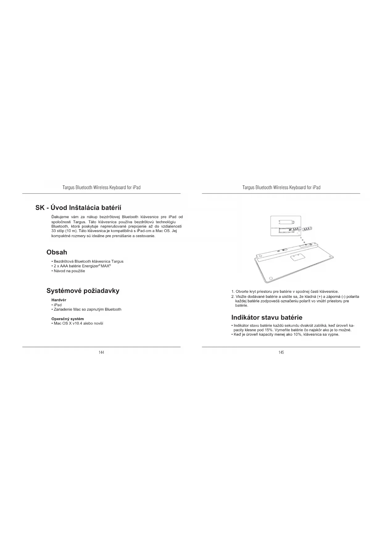 Funkcia Domáca obrazovkaHľadaťiPad prejde do režimu Photo Frame (Fotorámček)Zobraziť a skryť klávesnicu na displejiPretáčanie dozadu alebo prechod na predchádzajúcu skladbu, lm alebo prezentáciuPretáčanie dopredu alebo prechod na nasledujúcu skladbu, lm alebo prezentáciuPrehrávanie alebo pozastavenie skladieb, lmov alebo prezentáciíStlmenie zvuku na iPad-eZníženie hlasitosti na iPad-eZvýšenie hlasitosti na iPad-eZamknutie displeja Pripojenie cez Bluetooth: Mac 1. Presuňte sa na ikonu Bluetooth umiestnenú na pracovnej ploche alebo na systémovej lište a pre spustenie nastavenia na ňu dvakrát kliknite. Zvoľte “Turn Bluetooth On” pre zapnutie funkcie Bluetooth na vašom Mac. 2. Rolovaním v zozname vyberte možnosť “Set up Bluetooth Device...” (Nastaviť zariadenie Bluetooth).3. Spustí sa asistent nastavením Bluetooth. Riaďte sa pokynmi na obrazovke.4. Zvoľte “keyboard” (klávesnica) a kliknite na pokračovať pre spustenie nastavenia. Klávesnica musí byť pri pripájaní v režime “zisťovanie”.5. Stlačte tlačidlo Connect (Pripojiť) na zadnej strane bezdrôtovej Bluetooth klávesnice Targus pre zapnutie režimu zisťovania. Keď je klávesnica v režime zisťovania, indikátor nízkeho stavu napájania bliká namodro.6. Počítač začne vyhľadávať klávesnicu. Po nájdení sa klávesnica zobrazí v zozname. Označte “Bluetooth Keyboard” a stlačte pokračovať.7. Spustí sa párovanie s Bluetooth klávesnicou. Pre vykonanie operácie kliknite na pokračovať.8. Gratulujeme. Vaša Bluetooth klávesnica je nastavená a pripravená na používanie. Môžete zvoliť nastavenie iného zariadenia alebo kliknúť na Quit (Opustiť) pre opustenie nastavení.Targus Bluetooth Wireless Keyboard for iPad