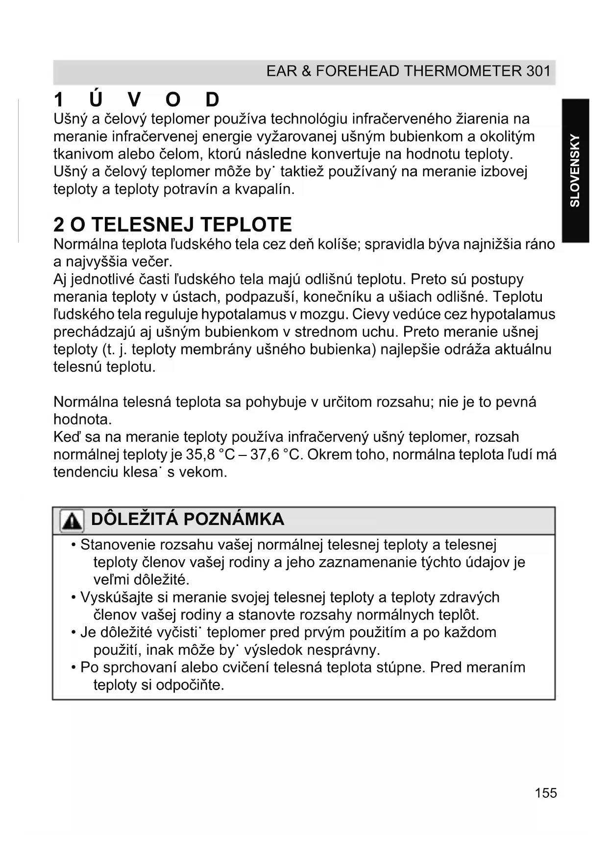 SLOVENSKY 1ÚVOD Ušný a elový teplomer používa technológiu infraerveného žiarenia na meranie infraervenej energie vyžarovanej ušným bubienkom a okolitým tkanivom alebo elom, ktorú následne konvertuje na hodnotu teploty. Ušný a elový teplomer môže by taktiež používaný na meranie izbovej teploty a teploty potravín a kvapalín.