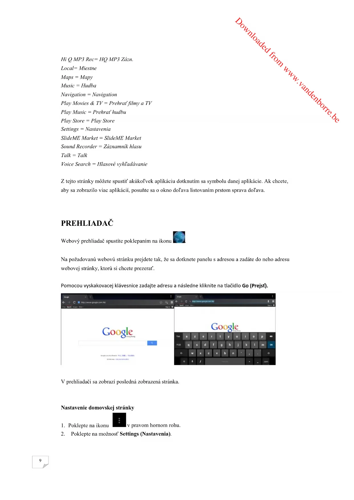 Apps = Aplikácie Widgets= Doplnky 4KPlayer = 4KPrehrávač Aldiko = Aldiko Browser = Prehliadač Calculator = Kalkulačka Calendar = Kalendár Camera = Fotoaparát Chrome = Chrome Clock = Hodiny Documents to Go = Dokumenty na cestu Downloads = Preberanie Email = Email ES File Explorer = Prieskumník ES File File Manager = Správca súborov Gallery = Galéria Gmail = Gmail Google = Google Google Settings = Nastavenia Google Downloaded from www.vandenborre.be9 Hi Q MP3 Rec= HQ MP3 Zázn. Local= Miestne Maps = Mapy Music = Hudba Navigation = Navigation Play Movies & TV = Prehrať filmy a TV Play Music = Prehrať hudbu Play Store = Play Store Settings = Nastavenia SlideME Market = SlideME Market Sound Recorder = Záznamník hlasu Talk = Talk Voice Search = Hlasové vyhľadávanie Z tejto stránky môžete spustiť akúkoľvek aplikáciu dotknutím sa symbolu danej aplikácie. Ak chcete, aby sa zobrazilo viac aplikácií, posuňte sa o okno doľava listovaním prstom sprava doľava.