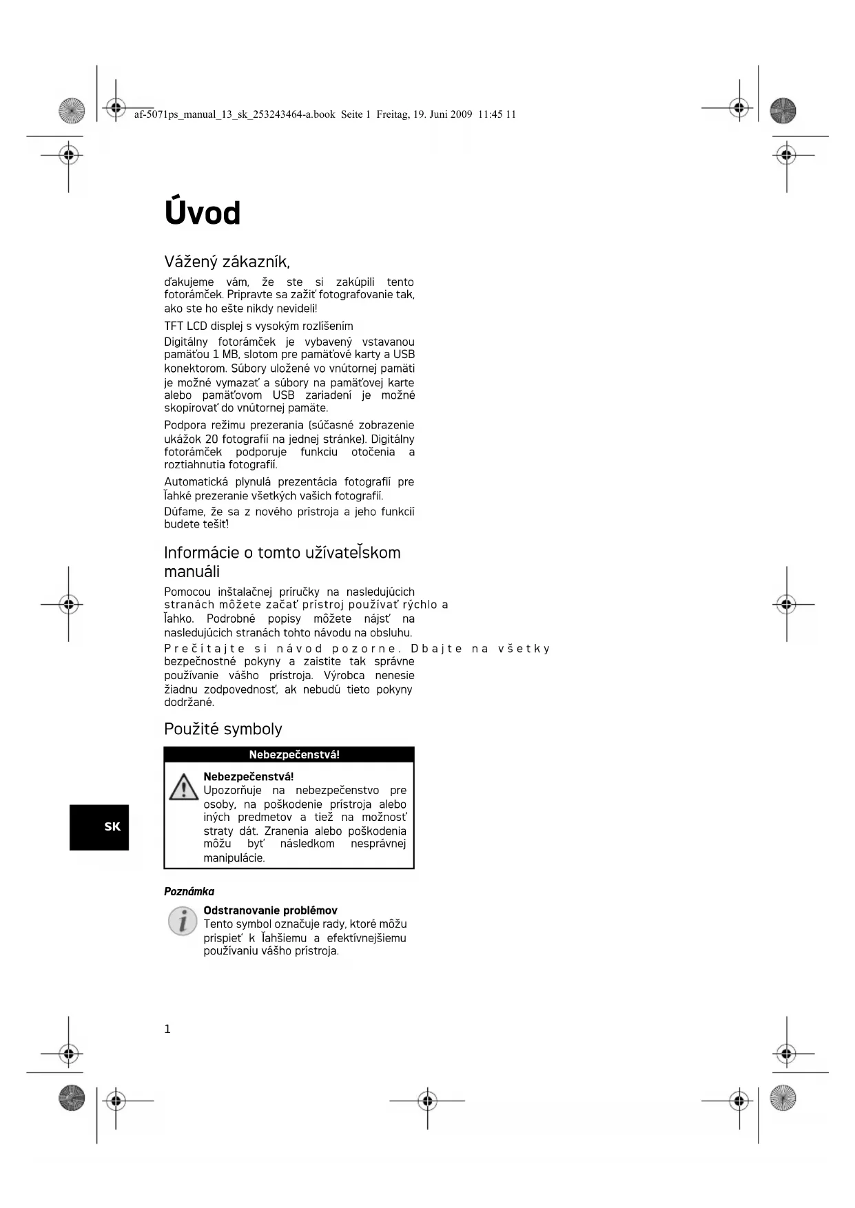 Úvod Vážený zákazník, ďakujeme vám, že ste si zakúpili tento fotorámček. Pripravte sa zažiť fotografovanie tak, ako ste ho ešte nikdy nevideli! TFT LCD displej s vysokým rozlíšením Pamäť Digitálny fotorámček je vybavený vstavanou pamäťou 1 MB, slotom pre pamäťové karty a USB konektorom. Súbory uložené vo vnútornej pamäti je možné vymazať a súbory na pamäťovej karte alebo pamäťovom USB zariadení je možné skopírovať do vnútornej pamäte. Podpora režimu prezerania (súčasné zobrazenie ukážok 20 fotografií na jednej stránke). Digitálny fotorámček podporuje funkciu otočenia a roztiahnutia fotografií. Automatická plynulá prezentácia fotografií pre ľahké prezeranie všetkých vašich fotografií. Dúfame, že sa z nového prístroja a jeho funkcií budete tešiť! Informácie o tomto užívateľskom manuáli Pomocou inštalačnej príručky na nasledujúcich stranách môžete začať prístroj používať rýchlo a ľahko. Podrobné popisy môžete nájsť na nasledujúcich stranách tohto návodu na obsluhu. Prečítajte si návod pozorne. Dbajte na všetky bezpečnostné pokyny a zaistite tak správne používanie vášho prístroja. Výrobca nenesie žiadnu zodpovednosť, ak nebudú tieto pokyny dodržané. Použité symboly Nebezpečenstvá Odstranovanie problémov Nebezpečenstvá! Nebezpečenstvá! Upozorňuje na nebezpečenstvo pre osoby, na poškodenie prístroja alebo iných predmetov a tiež na možnosť straty dát. Zranenia alebo poškodenia môžu byť následkom nesprávnej manipulácie. Poznámka Odstranovanie problémov Tento symbol označuje rady, ktoré môžu prispieť k ľahšiemu a efektívnejšiemu používaniu vášho prístroja. af-5071ps_manual_13_sk_253243464-a.book Seite 1 Freitag, 19. Juni 2009 11:45 112