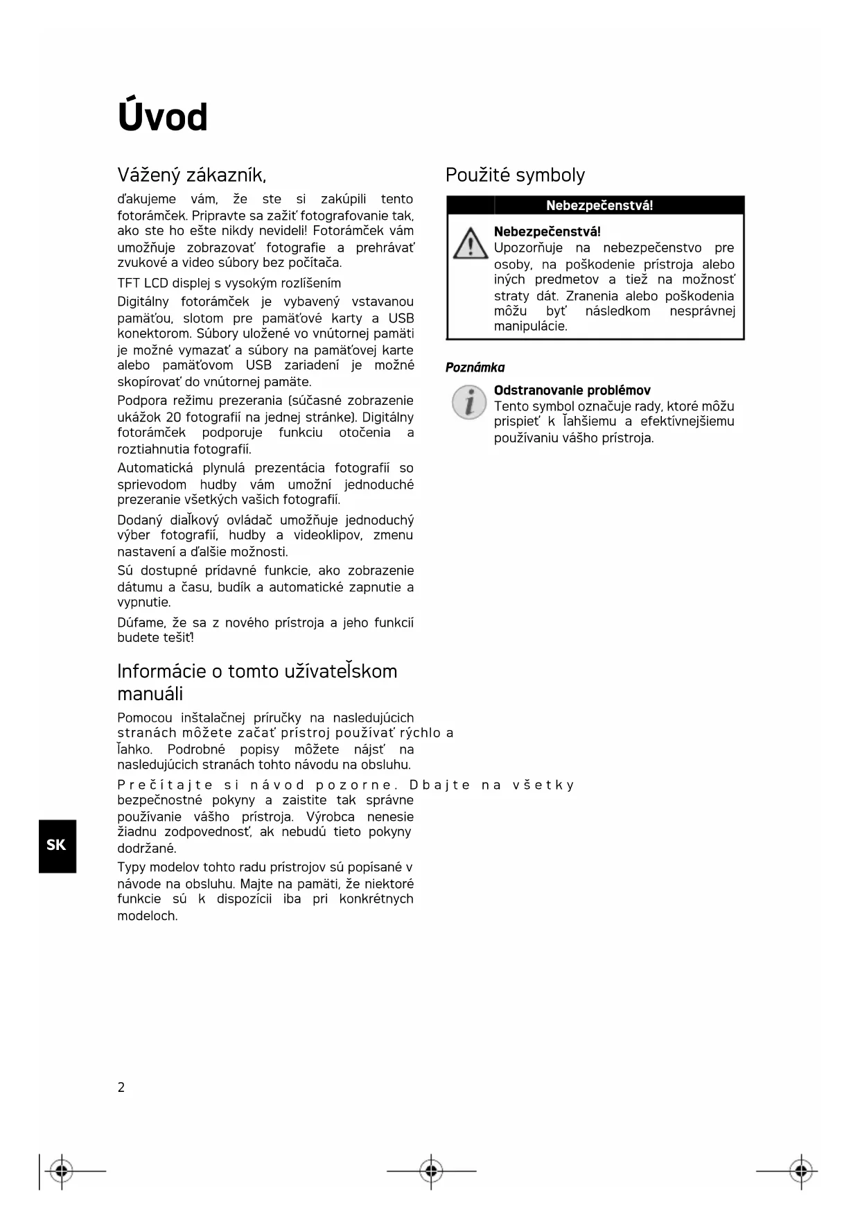 Úvod Vážený zákazník, ďakujeme vám, že ste si zakúpili tento fotorámček. Pripravte sa zažiť fotografovanie tak, ako ste ho ešte nikdy nevideli! Fotorámček vám umožňuje zobrazovať fotografie a prehrávať zvukové a video súbory bez počítača. TFT LCD displej s vysokým rozlíšením Pamäť Digitálny fotorámček je vybavený vstavanou pamäťou, slotom pre pamäťové karty a USB konektorom. Súbory uložené vo vnútornej pamäti je možné vymazať a súbory na pamäťovej karte alebo pamäťovom USB zariadení je možné skopírovať do vnútornej pamäte. Podpora režimu prezerania (súčasné zobrazenie ukážok 20 fotografií na jednej stránke). Digitálny fotorámček podporuje funkciu otočenia a roztiahnutia fotografií. Automatická plynulá prezentácia fotografií so sprievodom hudby vám umožní jednoduché prezeranie všetkých vašich fotografií. Dodaný diaľkový ovládač umožňuje jednoduchý výber fotografií, hudby a videoklipov, zmenu nastavení a ďalšie možnosti. Sú dostupné prídavné funkcie, ako zobrazenie dátumu a času, budík a automatické zapnutie a vypnutie. Dúfame, že sa z nového prístroja a jeho funkcií budete tešiť! Informácie o tomto užívateľskom manuáli Pomocou inštalačnej príručky na nasledujúcich stranách môžete začať prístroj používať rýchlo a ľahko. Podrobné popisy môžete nájsť na nasledujúcich stranách tohto návodu na obsluhu. Prečítajte si návod pozorne. Dbajte na všetky bezpečnostné pokyny a zaistite tak správne používanie vášho prístroja. Výrobca nenesie žiadnu zodpovednosť, ak nebudú tieto pokyny dodržané. Typy modelov tohto radu prístrojov sú popísané v návode na obsluhu. Majte na pamäti, že niektoré funkcie sú k dispozícii iba pri konkrétnych modeloch. Použité symboly Nebezpečenstvá Odstranovanie problémov Nebezpečenstvá! Nebezpečenstvá! Upozorňuje na nebezpečenstvo pre osoby, na poškodenie prístroja alebo iných predmetov a tiež na možnosť straty dát. Zranenia alebo poškodenia môžu byť následkom nesprávnej manipulácie. Poznámka Odstranovanie problémov Tento symbol označuje rady, ktoré môžu prispieť k ľahšiemu a efektívnejšiemu používaniu vášho prístroja. af-5077_5087_5107psms_manual_13_sk_253243477-a.book Seite 2 Donnerstag, 2. Juli 2009 12:03 123
