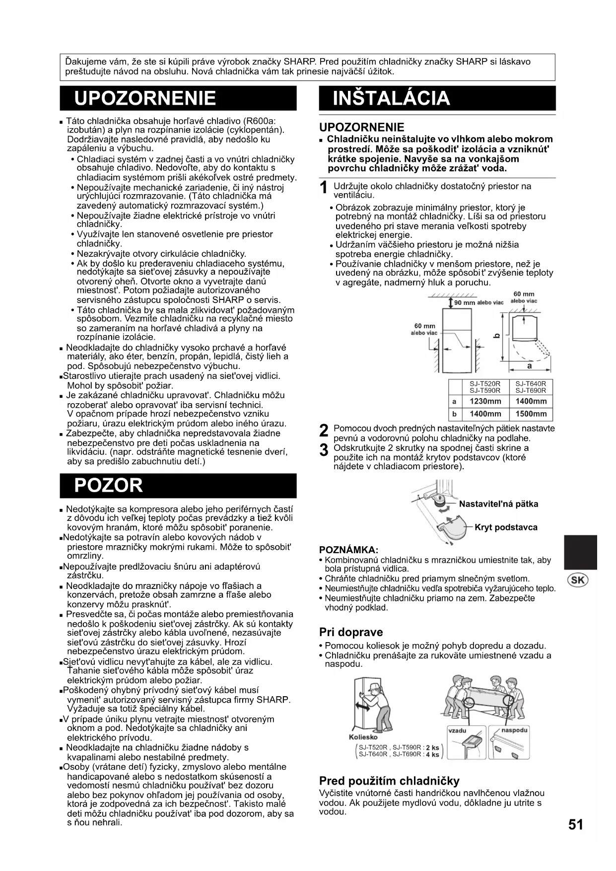 ■ Táto chladnička obsahuje horľavé chladivo (R600a: izobután) a plyn na rozpínanie izolácie (cyklopentán). Dodržiavajte nasledovné pravidlá, aby nedošlo ku zapáleniu a výbuchu. • Chladiaci systém v zadnej časti a vo vnútri chladničky obsahuje chladivo. Nedovoľte, aby do kontaktu s chladiacim systémom prišli akékoľvek ostré predmety. • Nepoužívajte mechanické zariadenie, či iný nástroj urýchlujúci rozmrazovanie. (Táto chladnička má zavedený automatický rozmrazovací systém.)• Nepoužívajte žiadne elektrické prístroje vo vnútri chladničky.• Využívajte len stanovené osvetlenie pre priestor chladničky. • Nezakrývajte otvory cirkulácie chladničky. • Ak by došlo ku prederaveniu chladiaceho systému, nedotýkajte sa siet'ovej zásuvky a nepoužívajte otvorený oheň. Otvorte okno a vyvetrajte danú miestnost'. Potom požiadajte autorizovaného servisného zástupcu spoločnosti SHARP o servis. • Táto chladnička by sa mala zlikvidovat' požadovaným