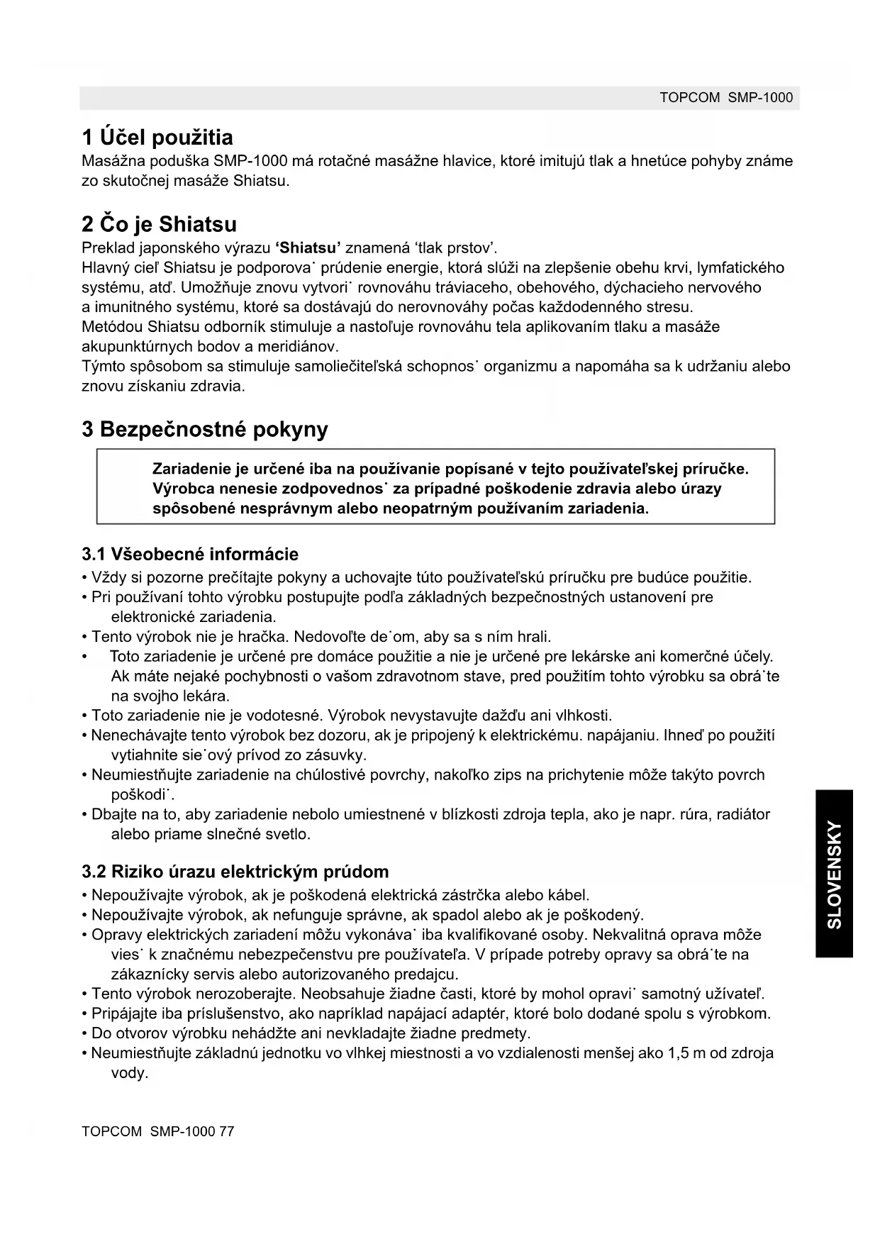- Neumiestujte základnú jednotku vo vlhkej miestnosti a vo vzdialenosti menšej ako 1,5 m od zdroja vody. Zariadenie je urené iba na používanie popísané v tejto používateskej príruke. Výrobca nenesie zodpovednos za prípadné poškodenie zdravia alebo úrazy spôsobené nesprávnym alebo neopatrným používaním zariadenia.78 TOPCOM SMP-1000 TOPCOM SMP-1000