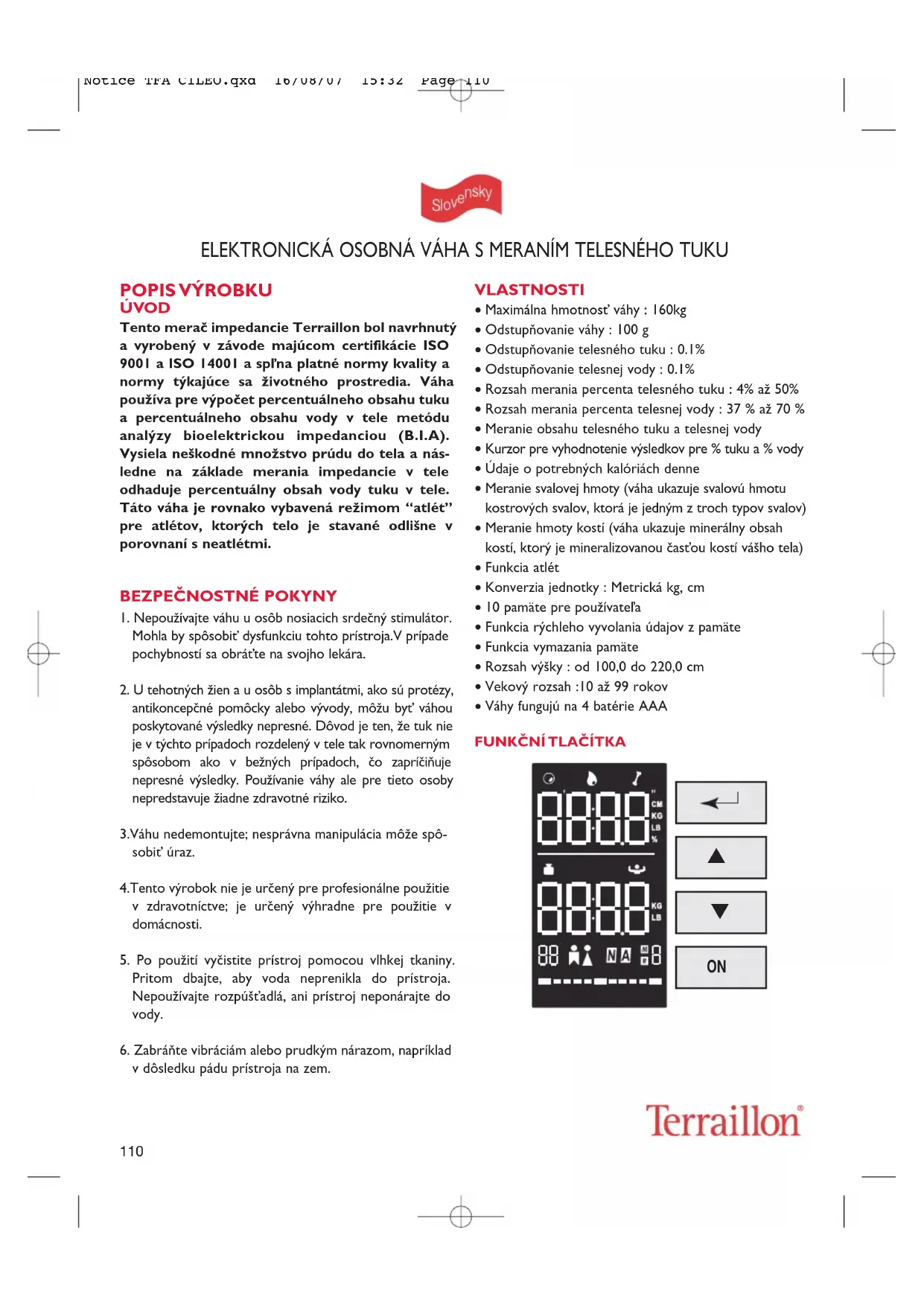 ÚVOD Tento merač impedancie Terraillon bol navrhnutýa vyrobený v závode majúcom certifikácie ISO9001 a ISO 14001 a spľna platné normy kvality anormy týkajúce sa životného prostredia. Váhapoužíva pre výpočet percentuálneho obsahu tukua percentuálneho obsahu vody v tele metóduanalýzy bioelektrickou impedanciou (B.I.A).Vysiela neškodné množstvo prúdu do tela a nás-ledne na základe merania impedancie v teleodhaduje percentuálny obsah vody tuku v tele.Táto váha je rovnako vybavená režimom “atlét”pre atlétov, ktorých telo je stavané odlišne vporovnaní s neatlétmi. BEZPEČNOSTNÉ POKYNY 1. Nepoužívajte váhu u osôb nosiacich srdečný stimulátor.Mohla by spôsobiť dysfunkciu tohto prístroja.V prípadepochybností sa obráťte na svojho lekára.2. U tehotných žien a u osôb s implantátmi, ako sú protézy,antikoncepčné pomôcky alebo vývody, môžu byť váhouposkytované výsledky nepresné. Dôvod je ten, že tuk nieje v týchto prípadoch rozdelený v tele tak rovnomernýmspôsobom ako v bežných prípadoch, čo zapríčiňujenepresné výsledky. Používanie váhy ale pre tieto osobynepredstavuje žiadne zdravotné riziko.3.Váhu nedemontujte; nesprávna manipulácia môže spô-sobiť úraz.4.Tento výrobok nie je určený pre profesionálne použitiev zdravotníctve; je určený výhradne pre použitie vdomácnosti.5. Po použití vyčistite prístroj pomocou vlhkej tkaniny.Pritom dbajte, aby voda neprenikla do prístroja.Nepoužívajte rozpúšťadlá, ani prístroj neponárajte dovody.6. Zabráňte vibráciám alebo prudkým nárazom, napríkladv dôsledku pádu prístroja na zem. VLASTNOSTI