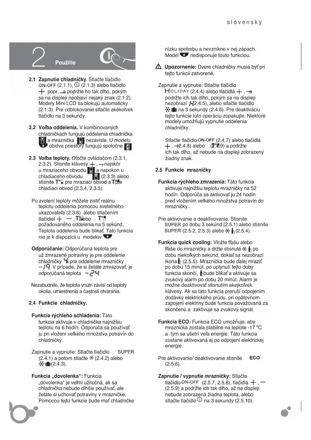 Zapnutie / vypnutie mraznicky: Stlacte tlacidlo ON-OFF (2.5.7, 2.5.8), tlacidla +, - (2.5.9) a podrzte ich tak dlho, až na displeji nebude zobrażné ziadna teplota, alebo stlacte tlacidlo ① na 3 sekundy (2.5.10).