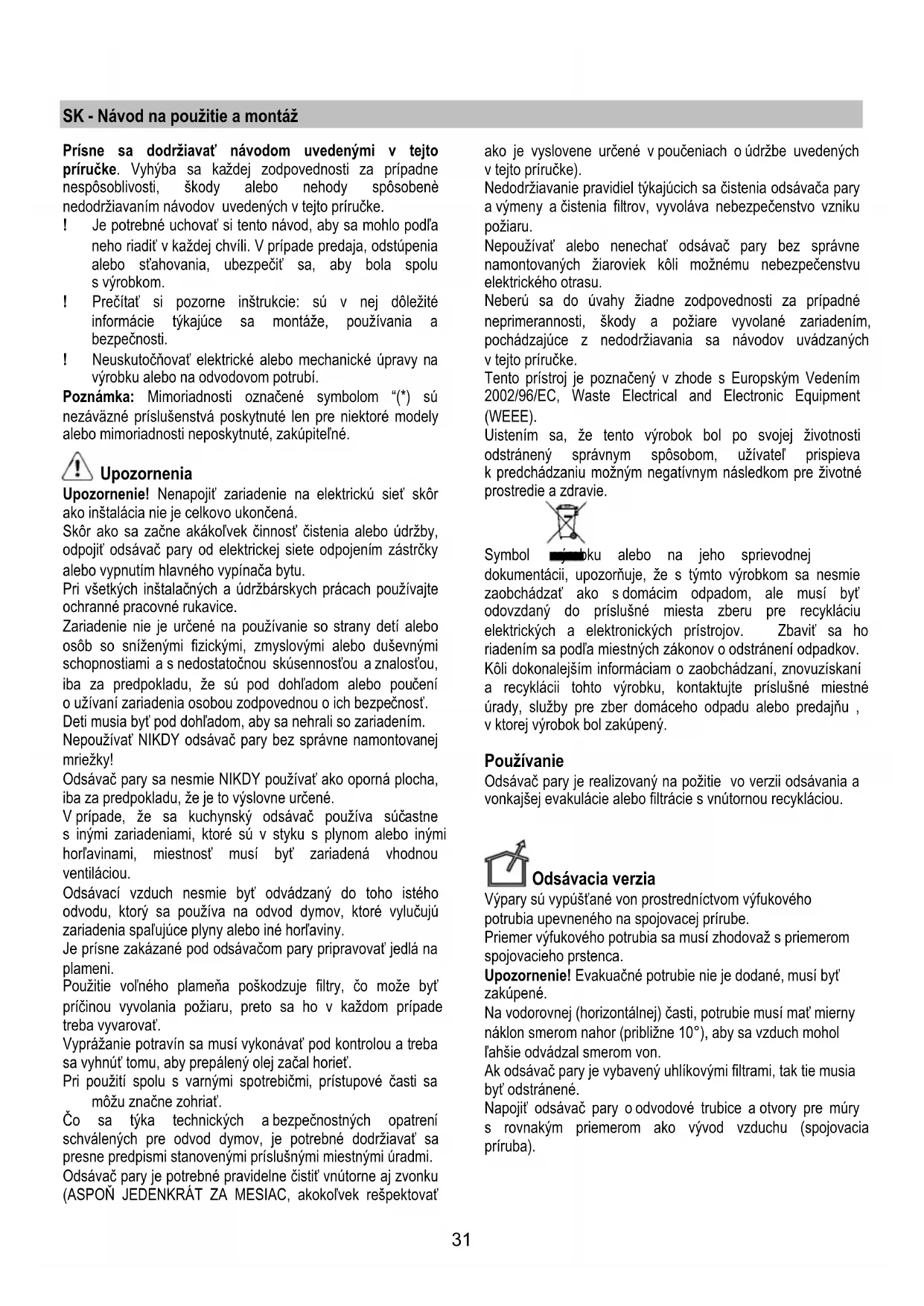 Odsávač pary sa nesmie NIKDY používať ako oporná plocha,