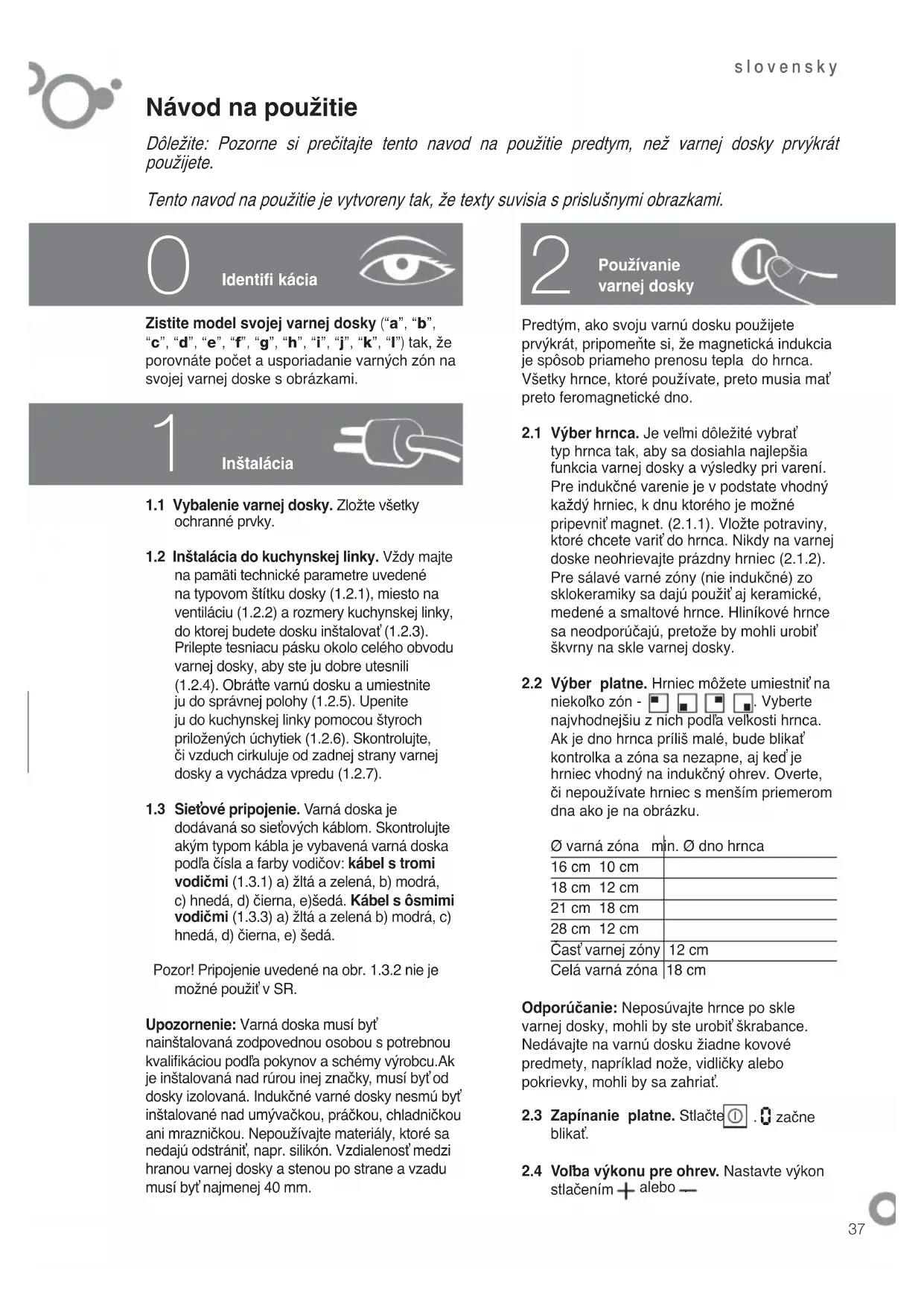 Identifi kácia Predtým, ako svoju varnú dosku použijete prvýkrát, pripomeňte si, že magnetická indukcia je spôsob priameho prenosu tepla do hrnca. Všetky hrnce, ktoré používate, preto musia mať preto feromagnetické dno. 2.1 Výber hrnca. Je veľmi dôležité vybrať typ hrnca tak, aby sa dosiahla najlepšia funkcia varnej dosky a výsledky pri varení. Pre indukčné varenie je v podstate vhodný každý hrniec, k dnu ktorého je možné pripevniť magnet. (2.1.1). Vložte potraviny, ktoré chcete variť do hrnca. Nikdy na varnej doske neohrievajte prázdny hrniec (2.1.2). Pre sálavé varné zóny (nie indukčné) zo sklokeramiky sa dajú použiť aj keramické, medené a smaltové hrnce. Hliníkové hrnce sa neodporúčajú, pretože by mohli urobiť škvrny na skle varnej dosky. 2.2 Výber platne. Hrniec môžete umiestniť na niekoľko zón -