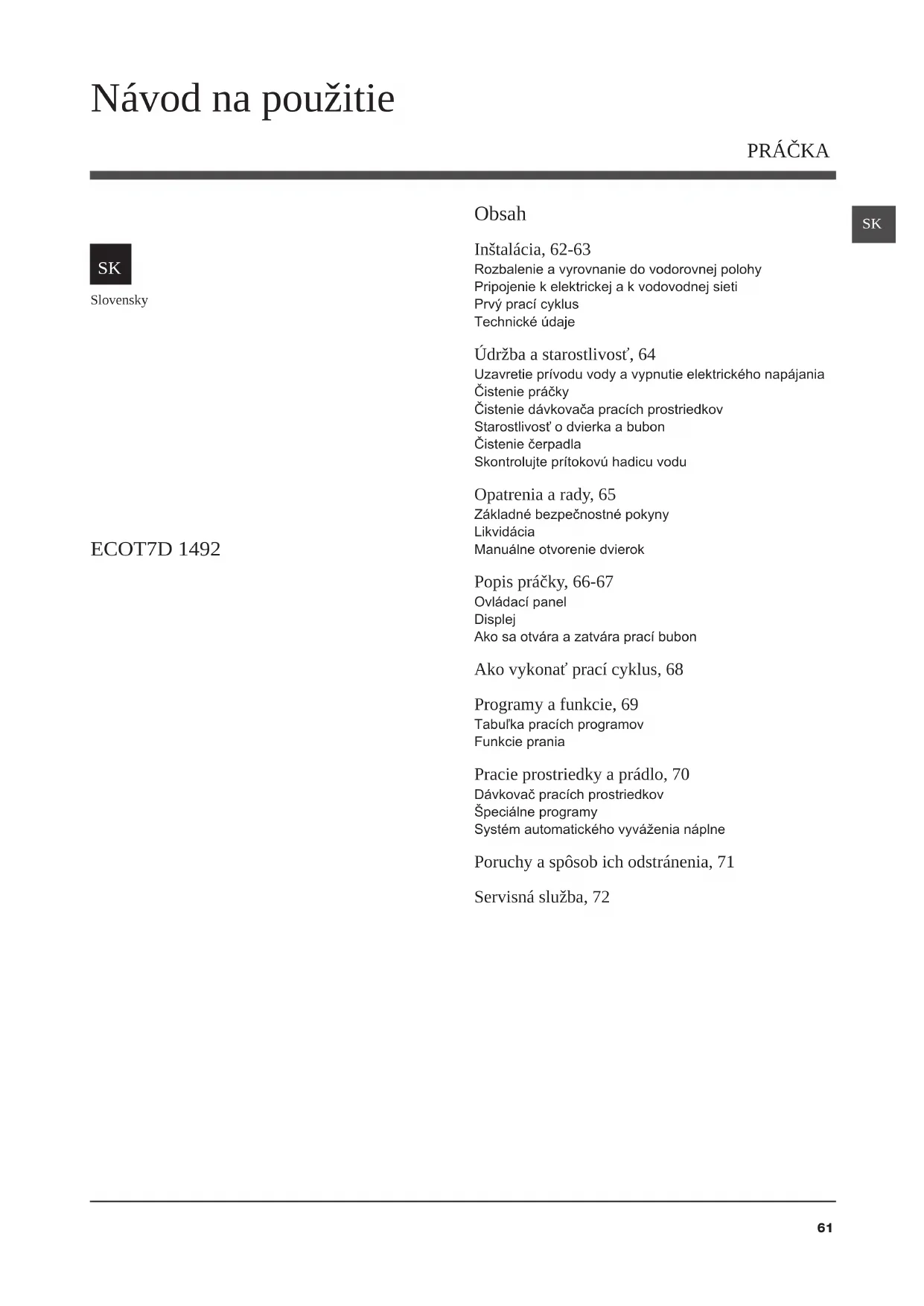 Slovensky Obsah Inštalácia, 62-63 Rozbalenie a vyrovnanie do vodorovnej polohy Pripojenie k elektrickej a k vodovodnej sieti Prvý prací cyklus Technické údaje Údržba a starostlivosť, 64 Uzavretie prívodu vody a vypnutie elektrického napájania Čistenie práčky Čistenie dávkovača pracích prostriedkov Starostlivosť o dvierka a bubon Čistenie čerpadla Skontrolujte prítokovú hadicu vodu Opatrenia a rady, 65 Základné bezpečnostné pokyny Likvidácia Manuálne otvorenie dvierok Popis práčky, 66-67 Ovládací panel Displej Ako sa otvára a zatvára prací bubon Ako vykonať prací cyklus, 68 Programy a funkcie, 69 Tabuľka pracích programov Funkcie prania Pracie prostriedky a prádlo, 70 Dávkovač pracích prostriedkov Špeciálne programy Systém automatického vyváženia náplne Poruchy a spôsob ich odstránenia, 71 Servisná služba, 72