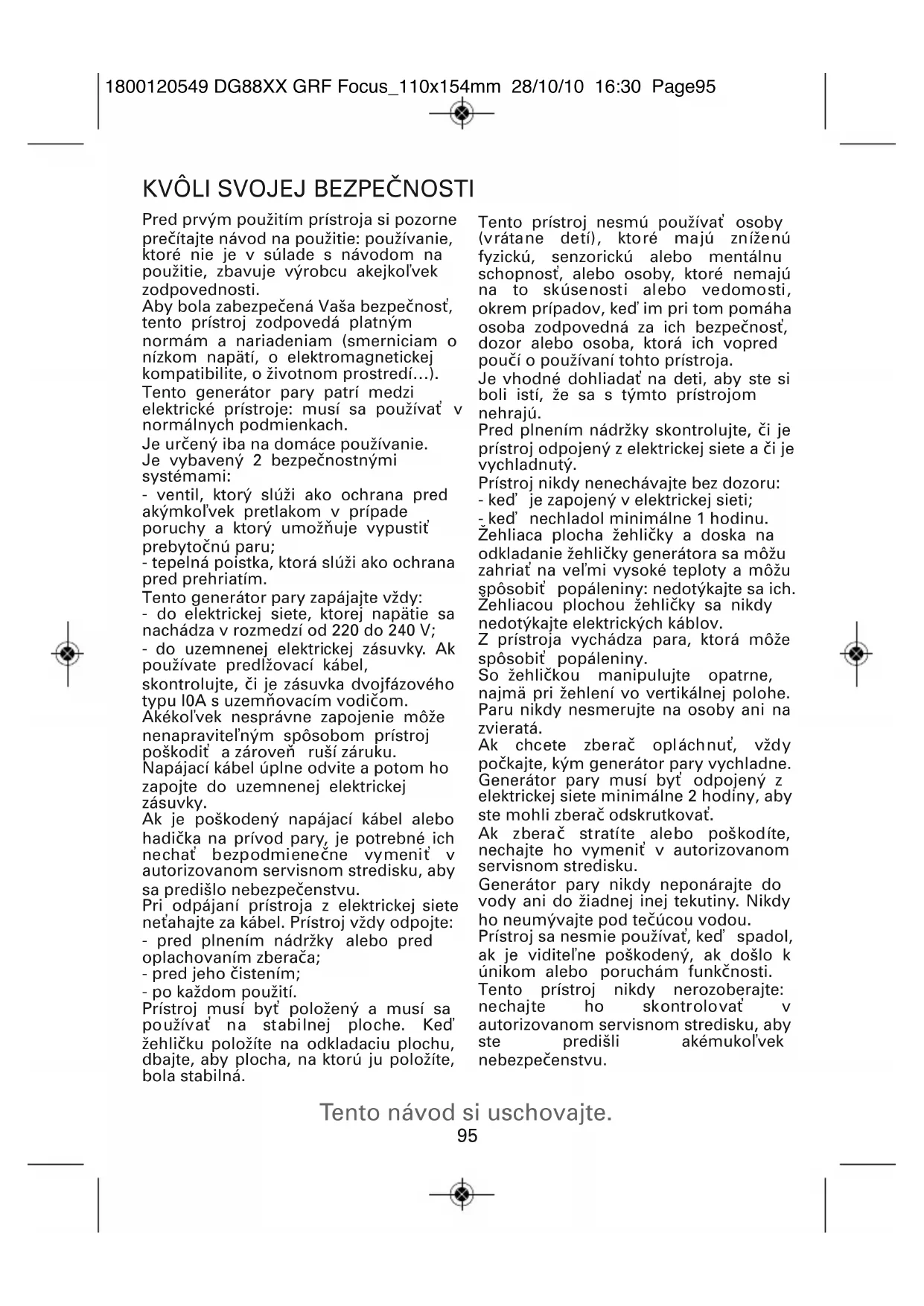 KVÔLI SVOJEJ BEZPEČNOSTI Pred prvým použitím prístroja si pozorne