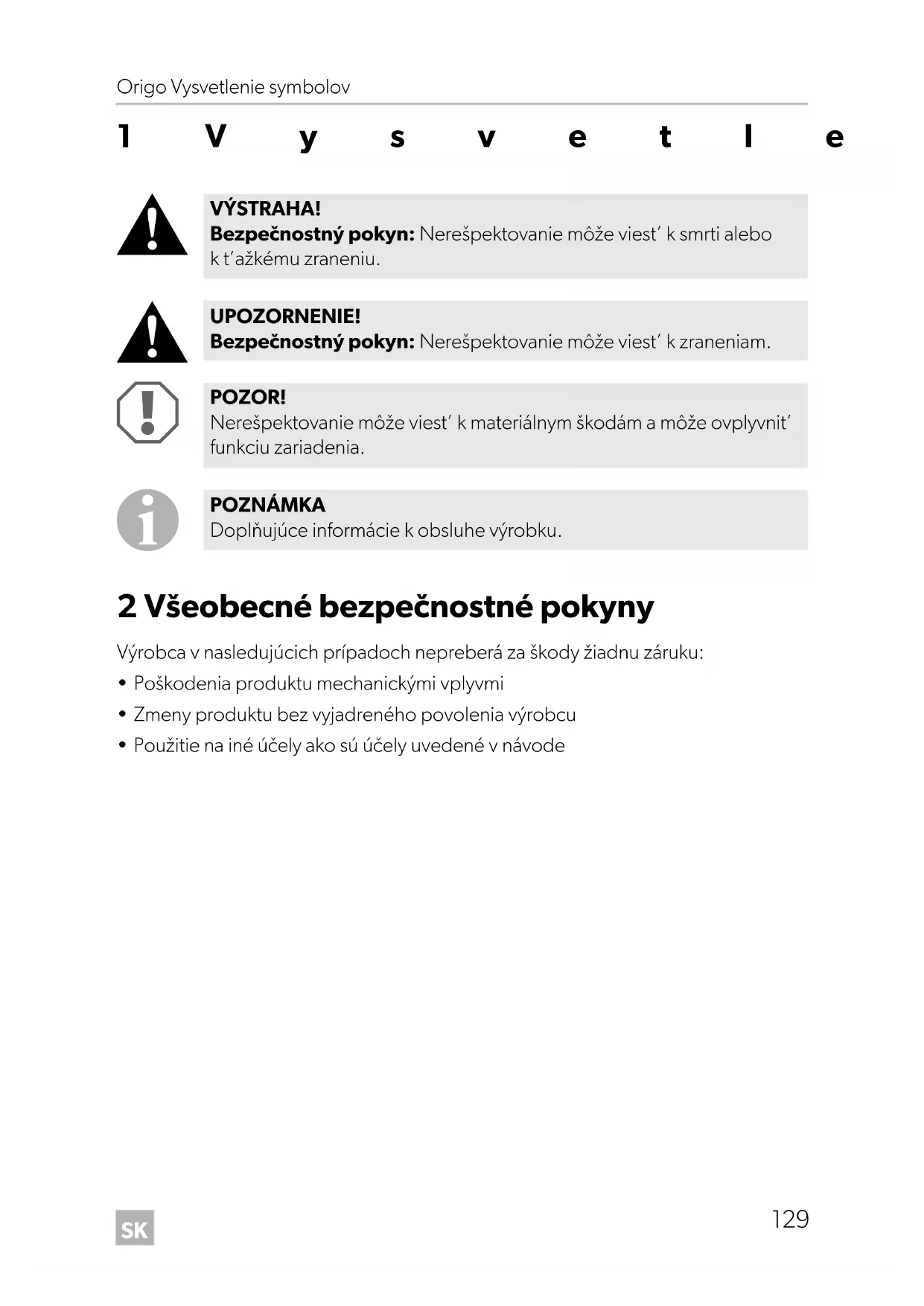 POZNÁMKA Doplňujúce informácie k obsluhe výrobku.SK Všeobecné bezpečnostné pokyny Origo