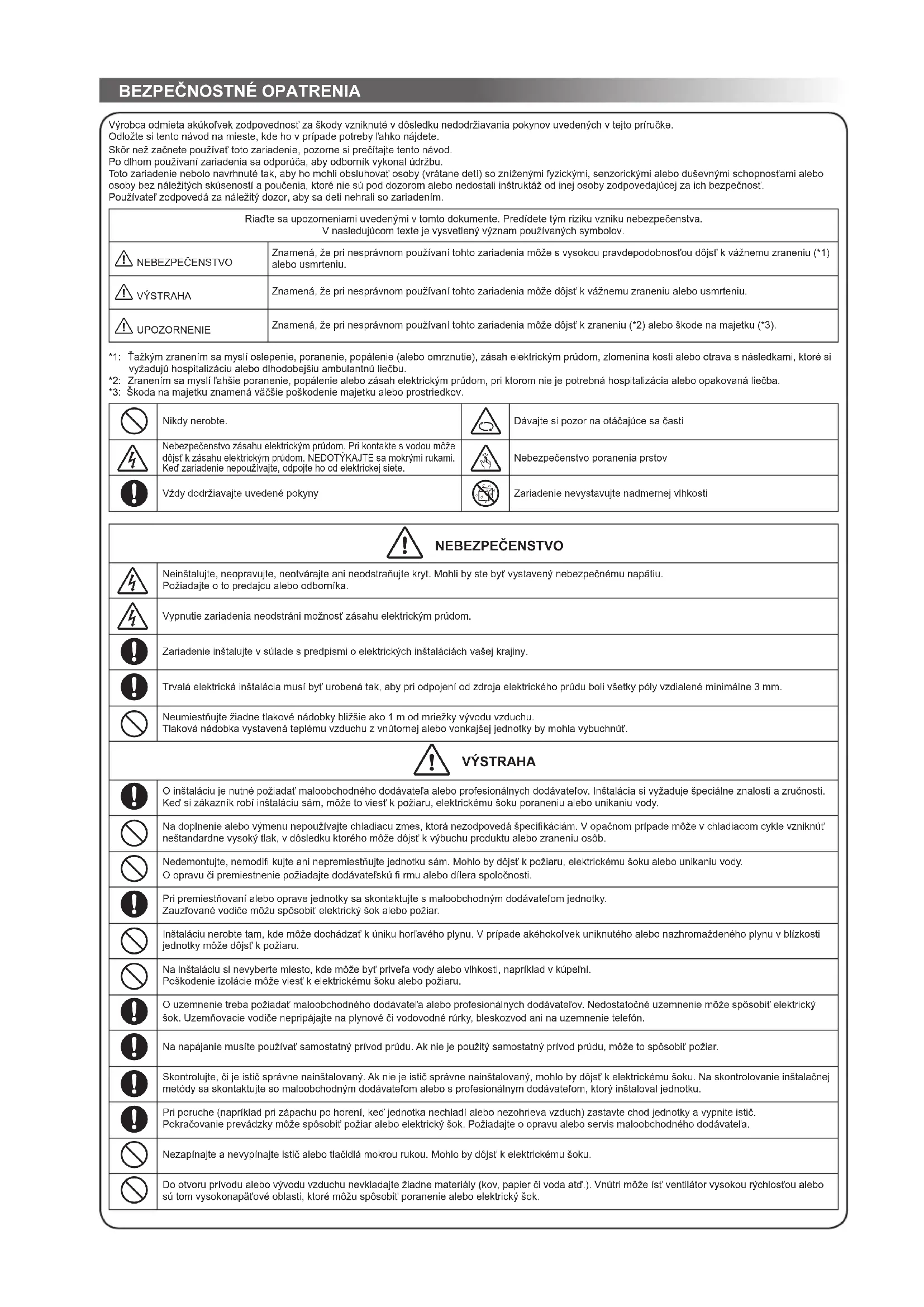 lebo praskanie môže byť spôsobené rozťahovaním/sťahovaním plastu. Poznámka: Položka 2 až 6 pri modeli s kúrenímPrevádzkové podmienky klimatizácieTeplota.PrevádzkaVonkajšia teplota Teplota v miestnostiKúrenie –15°C ~ 24°C Menej ako 28°COchladzovanie –10°C ~ 46°C 21°C ~ 32°CVysušovanie –10°C ~ 46°C 17°C ~ 32°C SKVARNOSTNA OPOZORILA Proizvajalec ni na kakršen koli način odgovoren za poškodbe povzročene z neupoštevanjem navodil v tem priročniku. Ta priročnik shranite na mesto, kjer vam bo po potrebi hitro dostopen.Pred uporabo si temeljito preberite uporabniški priročnik.Priporočamo, da po dolgotrajni uporabi strokovnjak izvede vzdrževalni poseg. Naprava ni namenjena uporabi oseb (vključno z otroki) z zmanjšanimi fi zičnimi, čutnimi in mentalnimi sposobnostmi ali pomanjkanjem izkušenj ali znanja, razen če so nadzorovane ali poučene glede uporabe naprave s strani osebe, ki je odgovorna za njihovo varnost. Otroke je potrebno nadzirati, da zagotovite, da se ne igrajo z napravo.Upoštevajte tukaj navedene previdnostne ukrepe, da preprečite tveganja za varnost.Simboli in njihovih pomeni so prikazani spodaj. 0 NEVARNOST Označuje, da pri nepravilni uporabi enote obstaja velika možnost hudih poškodb (*1) ali smrti. 0 OPOZORILO Označuje, da pri nepravilni uporabi enote lahko pride do hudih poškodb ali smrti. 0 PREVIDNO Označuje, da pri nepravilni uporabi enote lahko pride do osebnih poškodb (*2) ali gmotne škode (*3). *1: Huda poškodba pomeni slepoto, poškodbe, opekline (vroče ali mrzlo), električni udar, zlom kosti ali zastrupitev, pri katerih ostanejo posledice in je potrebna hospitalizacija ali dolgotrajno zdravljenje. *2: Osebne poškodbe pomeni lažje nesreče, opekline ali električni udar, pri katerih nista potrebna hospitalizacija ali zdravljenje v bolnišnici. *3: Gmotna škoda pomeni večjo poškodbo, ki vpliva na lastnino ali vire. Ne delajte nikoli. Bodite pozorni na vrteče se dele.