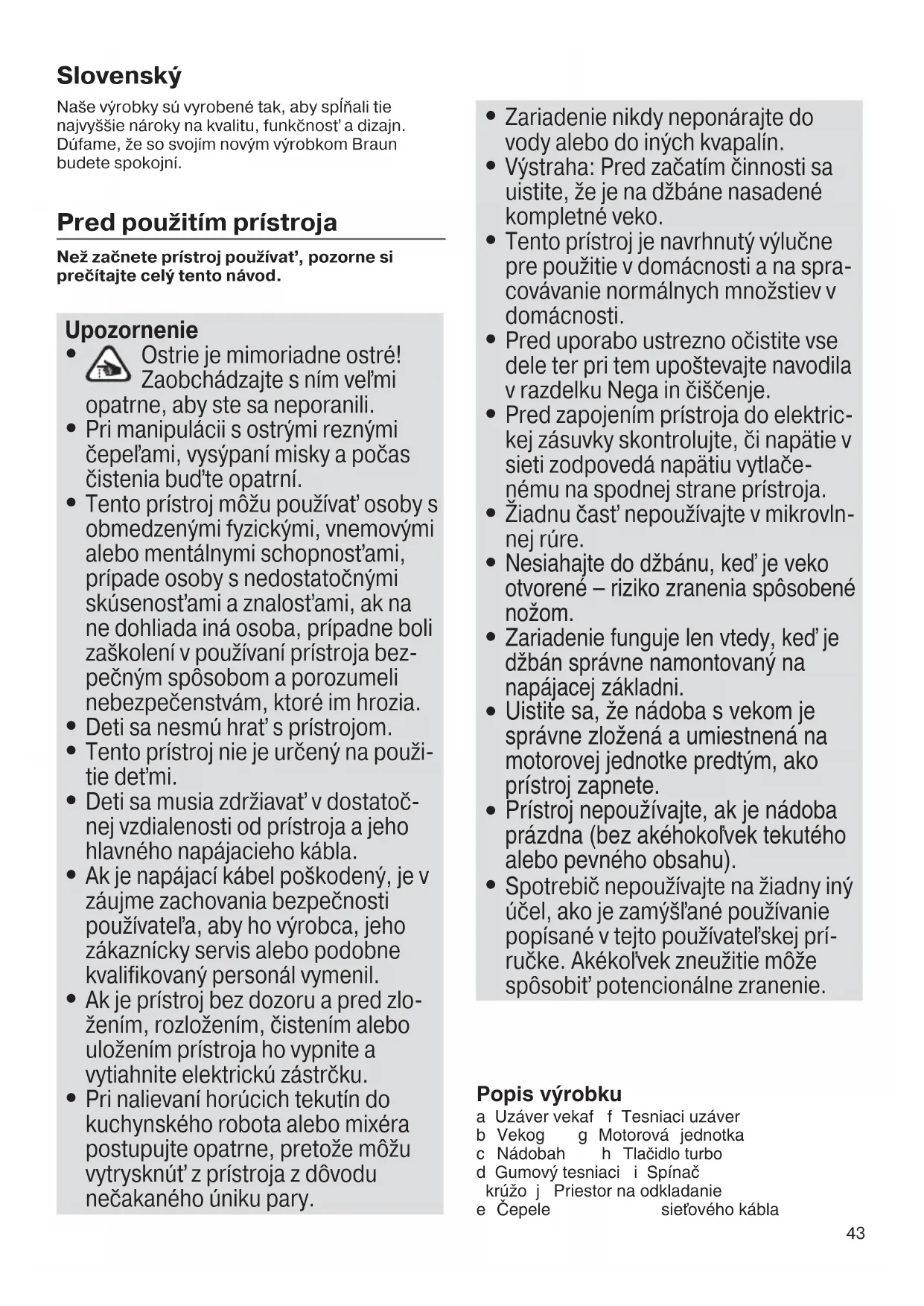 Spotrebič nepoužívajte na žiadny iný účel, ako je zamýšľané používanie popísané v tejto používateľskej prí- ručke. Akékoľvek zneužitie môže spôsobiť potencionálne zranenie. Popis v˘robku a Uzáver vekaf f Tesniaci uzáver b Vekog g Motorová jednotka c Nádobah h Tlačidlo turbo d Gumov˘ tesniaci i Spínaã krúÏo j Priestor na odkladanie e âepele sieÈového kábla 5722310344_JB3010_JB3060_JB3070_INT_S4-78.indd 43 05.07.17 15:3044 Pred pouÏitím