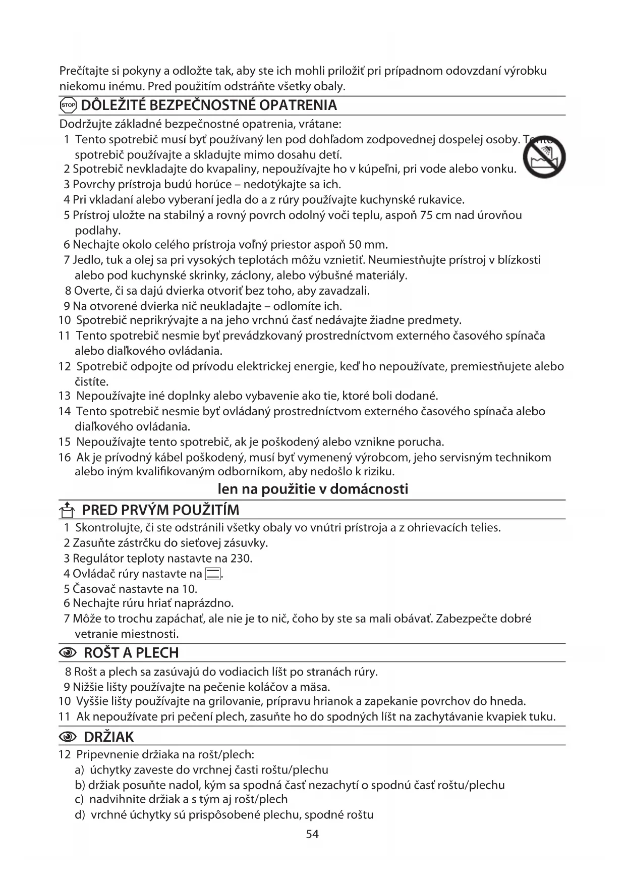 - Při přípravě balených potravin následujte pokyny uvedené na obalu či etiketě. potraviny teplota potraviny teplota hovězí 190-210 °C pečivo 190-210 °C chléb 200-220 °C vepřové 190-210 °C pečení v zapékací míse 140-160 °C quiche/flan 160-180 °C kuře 190-210 °C rich fruit cake 140-160 °C ryba 170-190 °C čajové koláčky 190-220 °C jehněčí 190-210 °C piškotový dort 160-180 °C pusinky 90 -110 °C yorkshirský pudink 200-220 °C mléčný pudink 140-160 °C54 Prečítajte si pokyny a odložte tak, aby ste ich mohli priložiť pri prípadnom odovzdaní výrobku niekomu inému. Pred použitím odstráňte všetky obaly. A DÔLEŽITÉ BEZPEČNOSTNÉ OPATRENIA Dodržujte základné bezpečnostné opatrenia, vrátane: 1 Tento spotrebič musí byť používaný len pod dohľadom zodpovednej dospelej osoby. Tento spotrebič používajte a skladujte mimo dosahu detí. 2 Spotrebič nevkladajte do kvapaliny, nepoužívajte ho v kúpeľni, pri vode alebo vonku. 3 Povrchy prístroja budú horúce – nedotýkajte sa ich. 4 Pri vkladaní alebo vyberaní jedla do a z rúry používajte kuchynské rukavice. 5 Prístroj uložte na stabilný a rovný povrch odolný voči teplu, aspoň 75 cm nad úrovňou podlahy. 6 Nechajte okolo celého prístroja voľný priestor aspoň 50 mm. 7 Jedlo, tuk a olej sa pri vysokých teplotách môžu vznietiť. Neumiestňujte prístroj v blízkosti alebo pod kuchynské skrinky, záclony, alebo výbušné materiály. 8 Overte, či sa dajú dvierka otvoriť bez toho, aby zavadzali. 9 Na otvorené dvierka nič neukladajte – odlomíte ich. 10 Spotrebič neprikrývajte a na jeho vrchnú časť nedávajte žiadne predmety. 11 Tento spotrebič nesmie byť prevádzkovaný prostredníctvom externého časového spínača alebo diaľkového ovládania. 12 Spotrebič odpojte od prívodu elektrickej energie, keď ho nepoužívate, premiestňujete alebo čistíte. 13 Nepoužívajte iné doplnky alebo vybavenie ako tie, ktoré boli dodané. 14 Tento spotrebič nesmie byť ovládaný prostredníctvom externého časového spínača alebo diaľkového ovládania. 15 Nepoužívajte tento spotrebič, ak je poškodený alebo vznikne porucha. 16 Ak je prívodný kábel poškodený, musí byť vymenený výrobcom, jeho servisným technikom alebo iným kvalifikovaným odborníkom, aby nedošlo k riziku. len na použitie v domácnosti U PRED PRVÝM POUŽITÍM 1 Skontrolujte, či ste odstránili všetky obaly vo vnútri prístroja a z ohrievacích telies. 2 Zasuňte zástrčku do sieťovej zásuvky. 3 Regulátor teploty nastavte na 230. 4 Ovládač rúry nastavte na H. 5 Časovač nastavte na 10. 6 Nechajte rúru hriať naprázdno. 7 Môže to trochu zapáchať, ale nie je to nič, čoho by ste sa mali obávať. Zabezpečte dobré vetranie miestnosti.