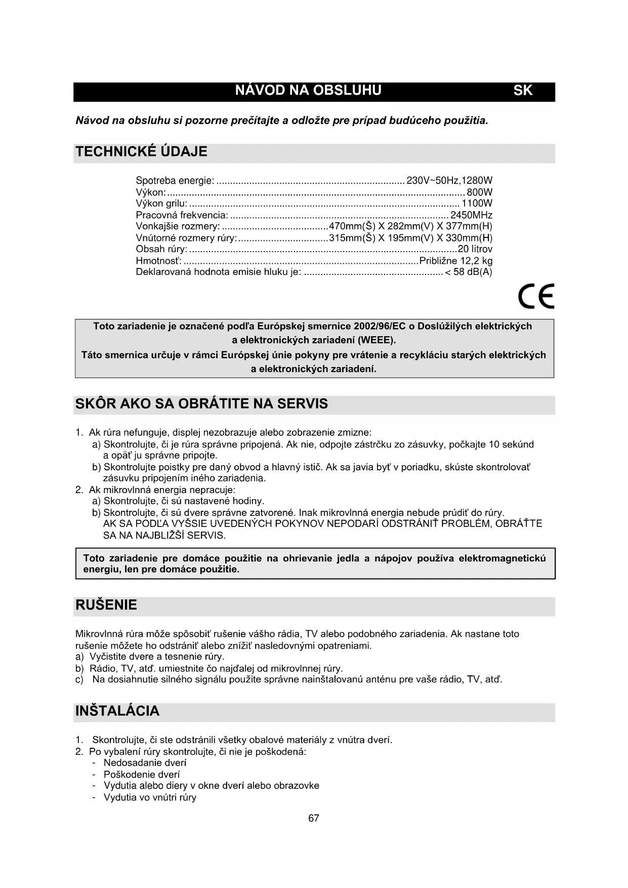 zariadenie nesmú pouţìvať osoby (vrátane detì), ktoré majú obmedzené telesné, zmyslové alebo mentálne schopnosti alebo ktoré nemajú dostatok skúsenostì a znalostì, pokiaľ nie sú pod dozoromalebo im nebolo vysvetlené pouţìvanie tohto zariadenia osobou zodpovednou za ich bezpeĉnosť. Deti musia byť pod dozorom, aby sa nehrali so zariadenìm. Rúra musì mať dostatoĉnú ventiláciu. Dodrţte 8 cm voľný priestor v zadu; 10 cm po stranách a 10 cm z hora. Neodstraňujte noţiĉky rúry a neblokujte ventilaĉné otvory. Pouţìvajte len kuchynský riad urĉený na pouţitie v mikrovlnnej rúre. Keć ohrievate potraviny v plastových alebo papierových obaloch, dávajte pozor, aby sa nevznietili; Ak spozorujete dym, vypnite alebo odpojte zariadenie a dvere nechajte zatvorené na uhasenie ohňa; Mikrovlnné ohrievanie môţe mať za následok oneskorené prevretie, preto bućte pri narábanì s nádobou opatrný; Obsah fľaše pre kojencov a detské poháre premiešajte alebo pretrepte a pred podávanìm deťom skontrolujte teplotu na zabránenie popálenia; Vajcia v škrupine a celé vajcia na tvrdo neohrievajte v mikrovlnnej rúre, pretoţe môţu explodovať, dokonca aj po skonĉenì ohrievania; Na ĉistenie povrchov dverì, tesnenia dverì, interiéru rúry pouţite len jemné nebrúsne mydlá, alebo ĉistiace prostriedky aplikované špongiou alebo jemnou tkaninou. Rúra by mala byť ĉistená pravidelne a mali by byť odstránené všetky zvyšky pokrmov; Neudrţiavanie rúry v ĉistých podmienkach môţe viesť k poškodeniu povrchu, ktorý môţe nepriaznivo ovplyvniť ţivotnosť zariadenia a môţe byť výsledkom nebezpeĉnej situácie; Ak je sieťová šnúra poškodená, musì byť vymenená výrobcom, servisom alebo podobne oprávnenou osobou na zabránenie rizika.69 BEZPEŢNOSTNÉ POKYNY PRE VŃEOBECNÉ POUŅITIE Niţšie sú uvedené, tak ako pri všetkých spotrebiĉoch, urĉité zásady na ovládanie a bezpeĉnosť na zaistenie špiĉkového výkonu tejto rúry:
