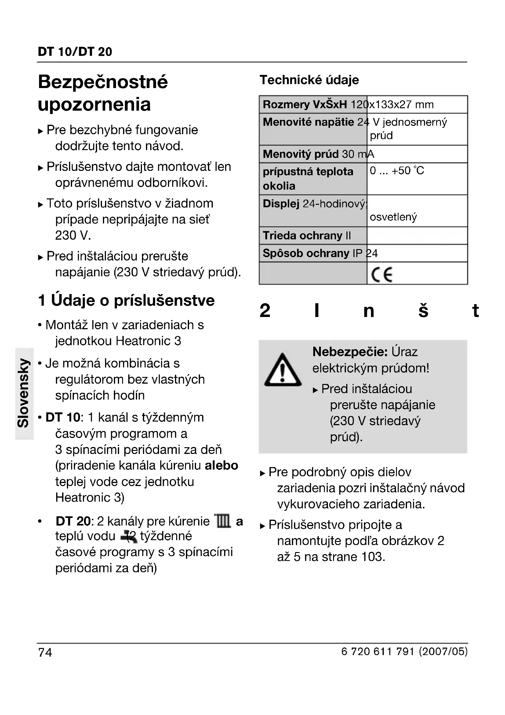 - DT 20: 2 kanály pre kúrenie a teplú vodu (2 týždenné časové programy s 3 spínacími periódami za deň) Technické údaje 2Inštalácia B Pre podrobný opis dielov zariadenia pozri inštalačný návod vykurovacieho zariadenia. B Príslušenstvo pripojte a namontujte poda obrázkov 2 až 5 na strane 103. Rozmery VxŠxH 120x133x27 mm Menovité napätie 24 V jednosmerný prúd Menovitý prúd 30 mA prípustná teplota okolia 0 ... +50 ˚C Displej 24-hodinový; osvetlený Trieda ochrany II Spôsob ochrany IP 24 Nebezpečie: Úraz elektrickým prúdom! B Pred inštaláciou prerušte napájanie (230 V striedavý prúd).75 DT 10/DT 20 6 720 611 791 (2007/05) Slovensky 3 Obsluha