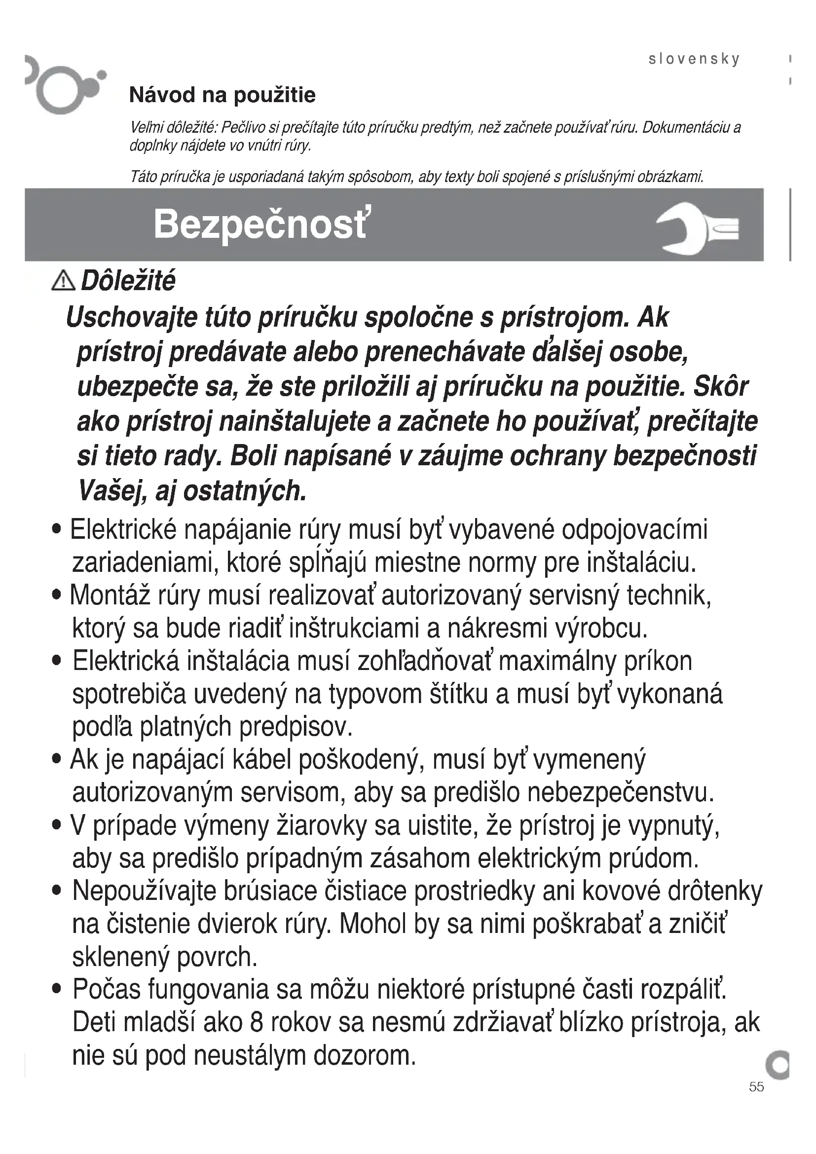 slovensky Návod na použitie Veľmi dôležité: Pečlivo si prečítajte túto príručku predtým, než začnete používať rúru. Dokumentáciu a doplnky nájdete vo vnútri rúry. Táto príručka je usporiadaná takým spôsobom, aby texty boli spojené s príslušnými obrázkami. Bezpečnosť