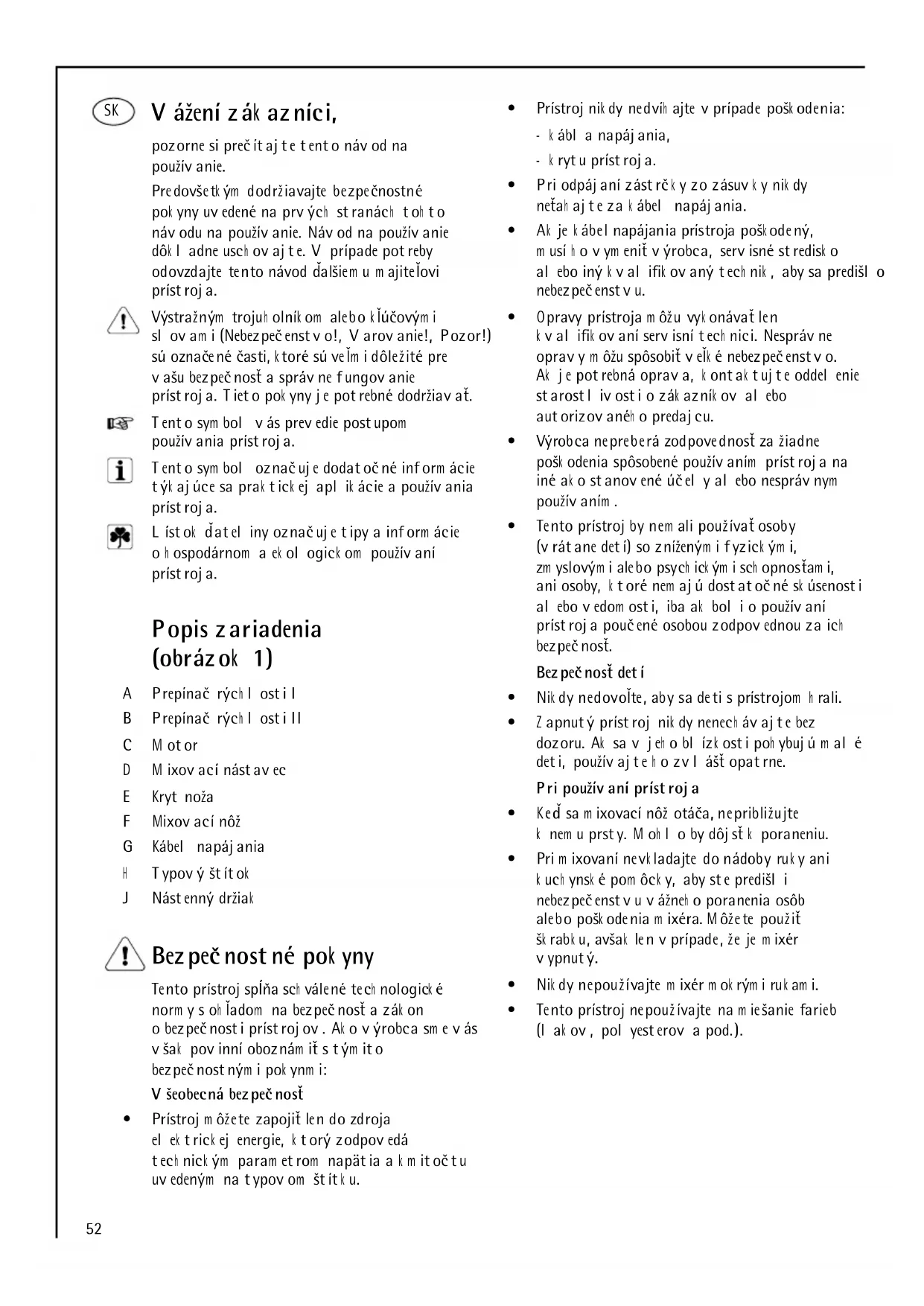 - Sm ěrnice pro elek trom agnetick ou slučitelnost 89 /336/EEC s dodatk y 9 2/31/EEC a 9 3/68/EEC52 Vážení zák azníci, pozorne si prečítajte tento návod na používanie. Predovšetk ým dodržiavajte bezpečnostné pok yny uvedené na prvých stranách toh to návodu na používanie. Návod na používanie dôk ladne usch ovajte. V prípade potreby odovzdajte tento návod ďalšiem u m ajiteľovi prístroja. Výstražným trojuh olník om alebo k ľúčovým i slovam i (Nebezpečenstvo!, Varovanie!, Pozor!) sú označené časti, k toré sú veľm i dôležité pre vašu bezpečnosť a správne fungovanie prístroja. Tieto pok yny je potrebné dodržiavať. Tento sym bol vás prevedie postupom používania prístroja. Tento sym bol označuje dodatočné inform ácie týk ajúce sa prak tick ej aplik ácie a používania prístroja. Lístok ďateliny označuje tipy a inform ácie o h ospodárnom a ek ologick om používaní prístroja. Popis zariadenia (obrázok 1) A Prepínač rých losti I B Prepínač rých losti II C M otor D M ixovací nástavec E Kryt noža F Mixovací nôž G Kábel napájania H Typový štítok J Nástenný držiak Bezpečnostné pok yny Tento prístroj spĺňa sch válené tech nologick é norm y s oh ľadom na bezpečnosť a zák on o bezpečnosti prístrojov. Ak o výrobca sm e vás však povinní oboznám iť s tým ito bezpečnostným i pok ynm i: Všeobecná bezpečnosť