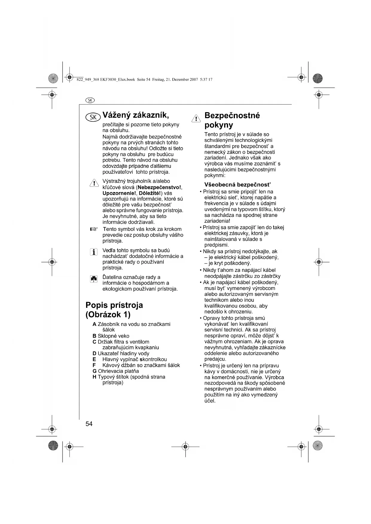 - Ak je napájací kábel poškodený, musí byt’ vymenený výrobcom alebo autorizovaným servisným technikom alebo inou kvalifikovanou osobou, aby nedošlo k ohrozeniu.• Opravy tohto prístroja smú vykonávat’ len kvalifikovaní servisní technici. Ak sa prístroj nesprávne opraví, môže dôjst’ k vážnym ohrozeniam. Ak je oprava nevyhnutná, vyhľadajte zákaznícke oddelenie alebo autorizovaného predajcu.• Prístroj je určený len na prípravu kávy v domácnosti, nie je určený na komerčné používanie. Výrobca nezodpovedá na škody spôsobené nesprávnym používaním alebo použitím na iný ako vymedzený účel.822_949_368 EKF3030_Elux.book Seite 54 Freitag, 21. Dezember 2007 5:37 17v