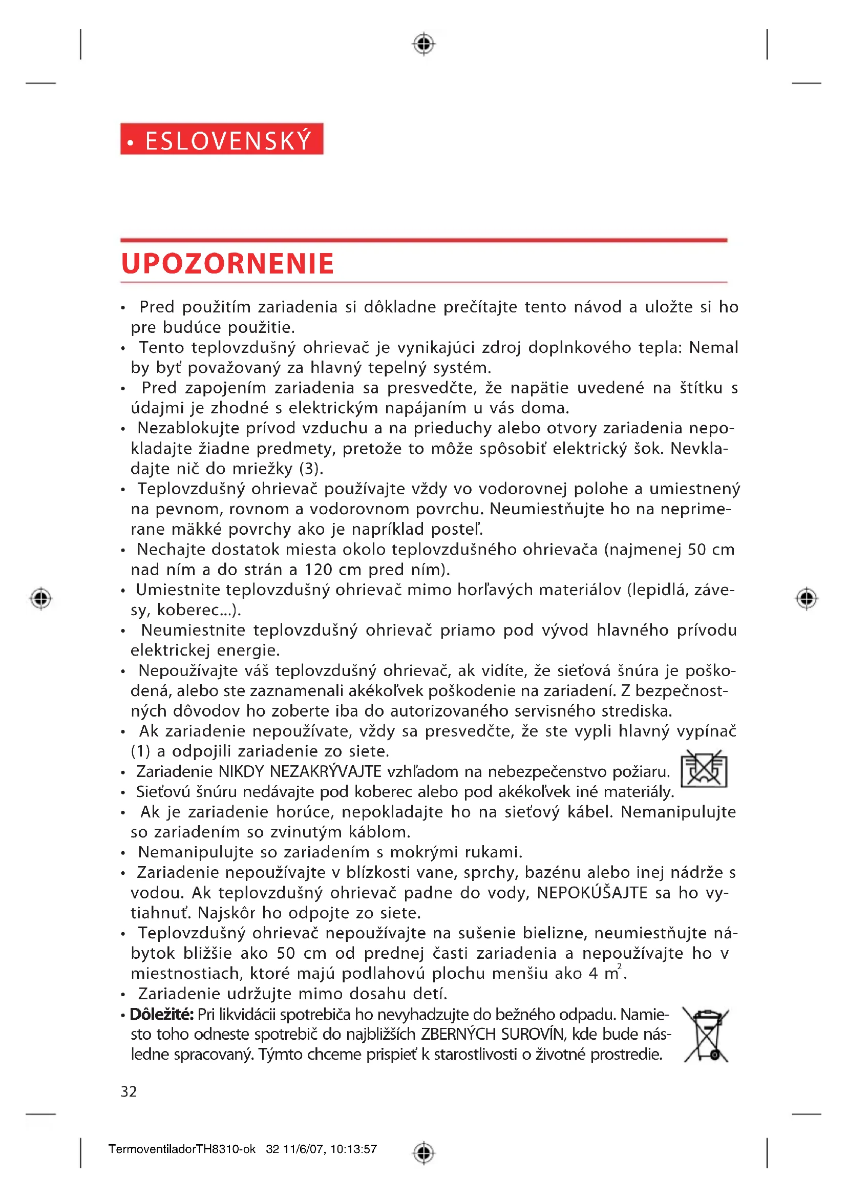 - Zariadenie je vybavené systémom ODPOJENIA PRI PREHRIATÍ. Ak sa vyskytne problém, tento systém zariadenie automaticky vypne. V tomto prípade po- stupujte nasledovne: