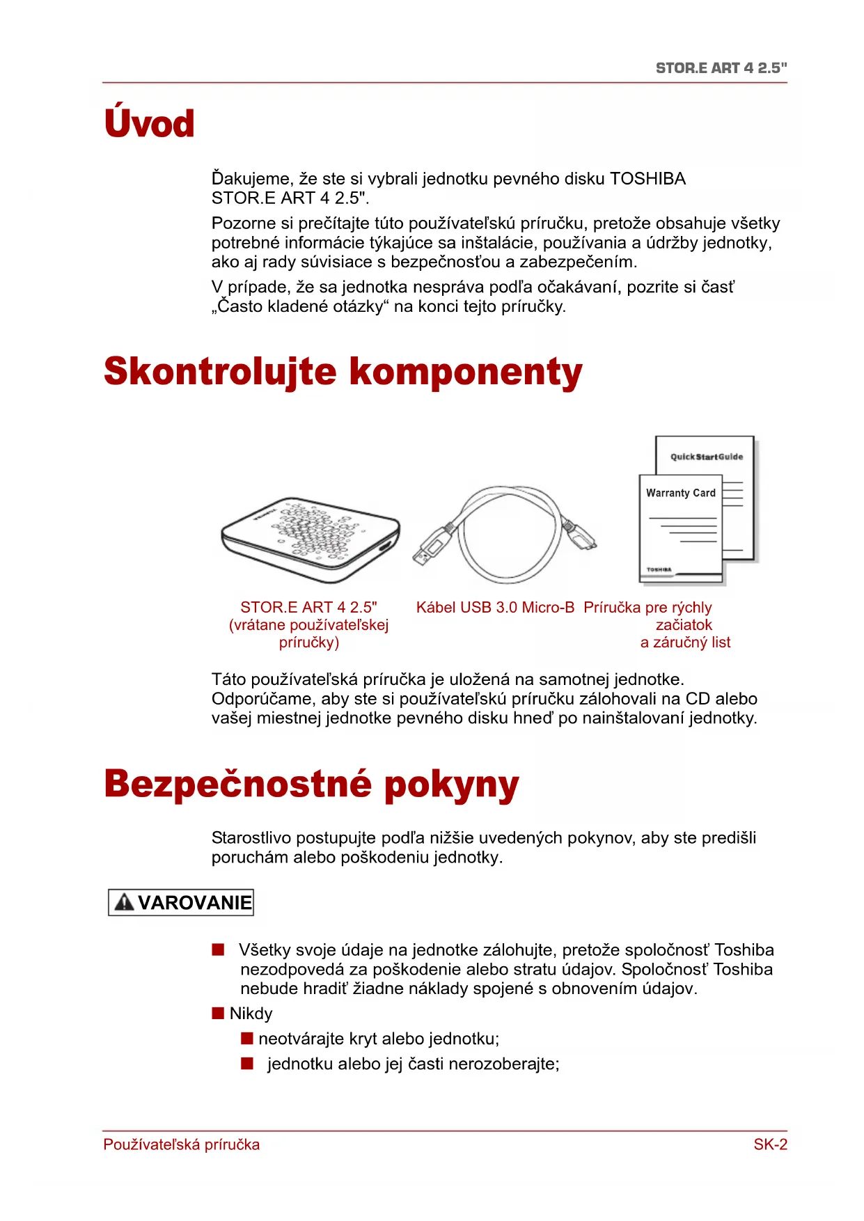 (vrátane používateľskej príručky) Kábel USB 3.0 Micro-B Príručka pre rýchly začiatok a záručný list VAROVANIEPoužívateľská príručka SK-3