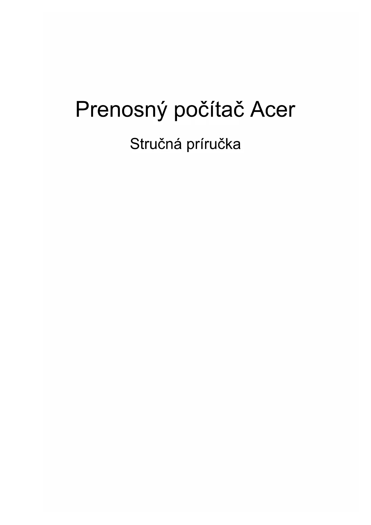 6Prenosný počítač Acer Stručná príručkaČíslo modelu: __________________________________ Sériové číslo: __________________________________ Dátum zakúpenia: ______________________________ Miesto zakúpenia: ______________________________ © 2010 Všetky práva vyhradené. Stručná príručka pre prenosný počítač Acer Pôvodné vydanie: 03/20103 Hneď na úvod Radi by sme vám poďakovali za rozvoj prenosných počítačov série Acer - vašej voľby pre vaše mobilné počítačové potreby. Vaše príručky Aby sme vám pomohli s používaním Acer, vytvorili sme pre vás sadu príručiek: V prvom rade plagát Práve začíname..., ktorý vám pomôže začat’ s nastavením vášho počítača. Všeobecná používateľská príručka pre sériu Aspire obsahuje užitočné informácie týkajúce sa všetkých modelov v produktovom rade Aspire. Obsahuje základné témy, ako napríklad informácie o používaní klávesnice, zvuku atď. Majte teda na pamäti, že Všeobecná používateľská príručka ako aj AcerSystem User Guide, ktorá je spomenutá ďalej, občas obsahujú informácie o funkciách a vlastnostiach, ktorými sú vybavené iba určité modely produktovej série a model, ktorý si zakúpili, nimi nemusí byt’ vybavený. Opis takýchto funkcií je v texte označený poznámkou v zmysle „len pre určité modely“. Stručná príručka sú základné funkcie a vlastnosti vášho nového počítača. Informácie o tom, ako vám počítač pomôže byt’ produktívnejší, nájdete v AcerSystem User Guide. Táto príručka obsahuje podrobné informácie o systémových programoch, obnove dát, možnostiach rozšírenia a riešenie problémov. Okrem toho obsahuje informácie o záruke a všeobecné vyhlásenia k predpisom a bezpečnosti. Je dostupná vo formáte PDF a je umiestnená vo vašom prenosnom počítači. Ak si chcete pozriet’ jej obsah, postupujte podľa nasledovných krokov: 1 Kliknite na Štart > Všetky programy > AcerSystem. 2 Kliknite na AcerSystem User Guide. Poznámka: Prezeranie súboru vyžaduje Adobe Reader. Ak na vašom počítači nie je Adobe Reader nainštalovaný, kliknutím na AcerSystem User Guide sa najprv spustí inštalácia programu Adobe Reader. Inštaláciu dokončíte podľa inštrukcií, ktoré uvidíte na obrazovke. Inštrukcie ako používat’ Adobe Reader nájdete v menu Pomocník a Podpora.4 Slovenčina Zoznámte sa so svojím prenosným počítačom Acer Po nastavení vášho počítača podľa Práve začíname... nám dovoľte, aby sme vás zoznámili s vaším novým prenosným počítačom Acer. Pohľad zhora