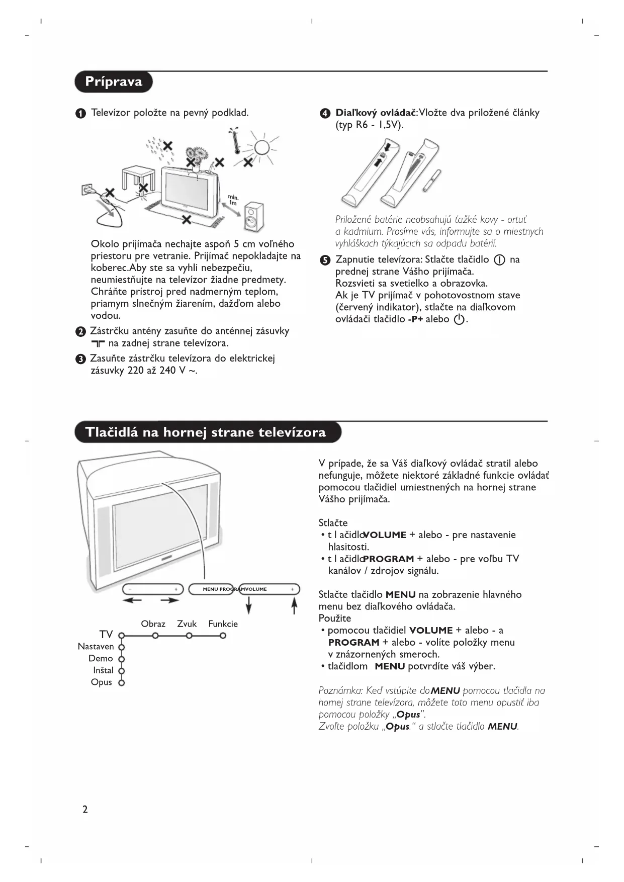 - Můžete použít tlačítko MENU a tlačítka +/- na horním panelu TV. Menu Zvolili jste nesprávné menu? Dalším stiskem tlačítka MENU toto menu opusťte. Standby Tento televizor spotřebovává určité množství energie i v pohotovostním (Standby) režimu. Spotřeba elektrické energie negativně přispívá ke znečišťování ovzduší avody. Příkon v režimu Standby: 1 W.1 Obsah Príprava ............................................................................................. 2 Tlačidlá na hornej strane televízora ........................................... 2 Použitie diaľkového ovládača ................................................... 3-4 Použitie menu .................................................................................. 5 Voľba jazyka a krajiny .................................................................... 5 Uloženie TV kanálov ...................................................................... 6 Automatická inštalácia ..................................................... 6 Manuálna inštalácia ........................................................... 6 Priradenie názvu ............................................................... 6 Usporiadanie programov ................................................ 7 Výber obľúbených TV kanálov....................................... 7 Nastavenie televízora .................................................................... 7 Všeobecné .......................................................................... 7 Zdroj signálu ......................................................................8 Dekóder ............................................................................. 8 Ukážka (Demo) ................................................................................9 Inštalácia TV menu Menu „obraz“ .............................................................. 9-10 Menu „zvuk“ .................................................................... 10 Menu „funkcie“ ............................................................... 11 Sprievodca teletextom ................................................................ 12 Teletext ..................................................................................... 13-14 Zapojenie príslušenstva Pripojenie a voľba príslušenstva ..........................................15-16 Tlačidlá pre ovládanie audio a video zariadení ...................... 17 Rady ............................................................................................... 18 Prevádzka EasyLink je založený na princípe „obsluha pomocou jedného tlačidla“. To znamená, že keď sú napr. televízor a videorekordér vybavené EasyLinkom a vzájomne prepojené euro-káblom (dodáva sa s videorekordérom), je možné vykonávať rôzne operácie zároveň na oboch prístrojoch. R Keď doslúži... Philips sa sústreďuje na výrobu šetrnú voči životnému prostrediu. Váš nový televízor pozostáva z materiálov, ktoré je možné recyklovať a znovu použiť. Keď doslúži, špecializované spoločnosti môžu z prístroja vybrať použiteľné súčiastky a tým minimalizovať množstvo odpadu. Prosím, uistite sa, že váš starý televízor likvidujete v súlade s miestnymi predpismi. Potrebujete pomôcť? Ak vám tento návod na obsluhu neposkytne informáciu ktorú potrebujete, alebo nepomôže vyriešiť váš problém s TV prijímačom, obráťte sa na najbližšie servisné stredisko Philips (viď. záručný list). Model a výrobné číslo, ktoré nájdete na zadnej strane TV prijímača, si prosím pripravte skôr, ako zavoláte servisné stredisko. Model: Výrobné číslo: Z dôvodu priebežného zdokonaľovanie produktu si vyhradzujeme právo na zmeny v manuáli bez predchádzajúceho upozornenia. SK2 & Te levízor položte na pevný podklad. Okolo prijímača nechajte aspoň 5 cm voľného priestoru pre vetranie. Prijímač nepokladajte na koberec.Aby ste sa vyhli nebezpečiu, neumiestňujte na televízor žiadne predmety. Chráňte prístroj pred nadmerným teplom, priamym slnečným žiarením, dažďom alebo vodou. é Zástrčku antény zasuňte do anténnej zásuvky x na zadnej strane televízora. “ Zasuňte zástrčku televízora do elektrickej zásuvky 220 až 240 V ~. ‘ Diaľkový ovládač:Vložte dva priložené články (typ R6 - 1,5V). Priložené batérie neobsahujú ťažké kovy - ortuť a kadmium. Prosíme vás, informujte sa o miestnych vyhláškach týkajúcich sa odpadu batérií. ( Zapnutie televízora: Stlačte tlačidlo A na prednej strane Vášho prijímača. Rozsvieti sa svetielko a obrazovka. Ak je TV prijímač v pohotovostnom stave (červený indikator), stlačte na diaľkovom ovládači tlačidlo -P+ alebo B. Príprava