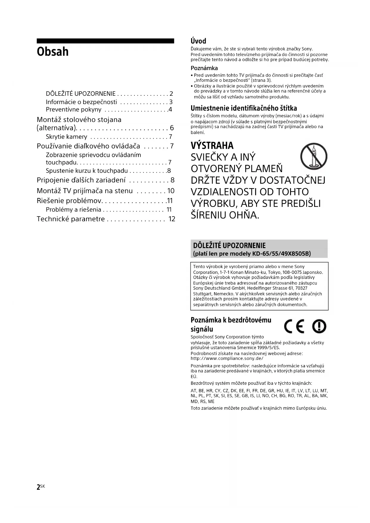 - Technické parametre Úvod Ďakujeme vám, že ste si vybrali tento výrobok značky Sony. Pred uvedením tohto televízneho prijímača do činnosti si pozorne prečítajte tento návod a odložte si ho pre prípad budúcej potreby.Poznámka• Pred uvedením tohto TV prijímača do činnosti si prečítajte časť „Informácie o bezpečnosti“ (strana 3). • Obrázky a ilustrácie použité v sprievodcovi rýchlym uvedením do prevádzky a v tomto návode slúžia len na referenčné účely a môžu sa líšiť od vzhľadu samotného produktu. Umiestnenie identifikačného štítka Štítky s číslom modelu, dátumom výroby (mesiac/rok) a s údajmi o napájacom zdroji (v súlade s platnými bezpečnostnými predpismi) sa nachádzajú na zadnej časti TV prijímača alebo na balení. VÝSTRAHA p. 12