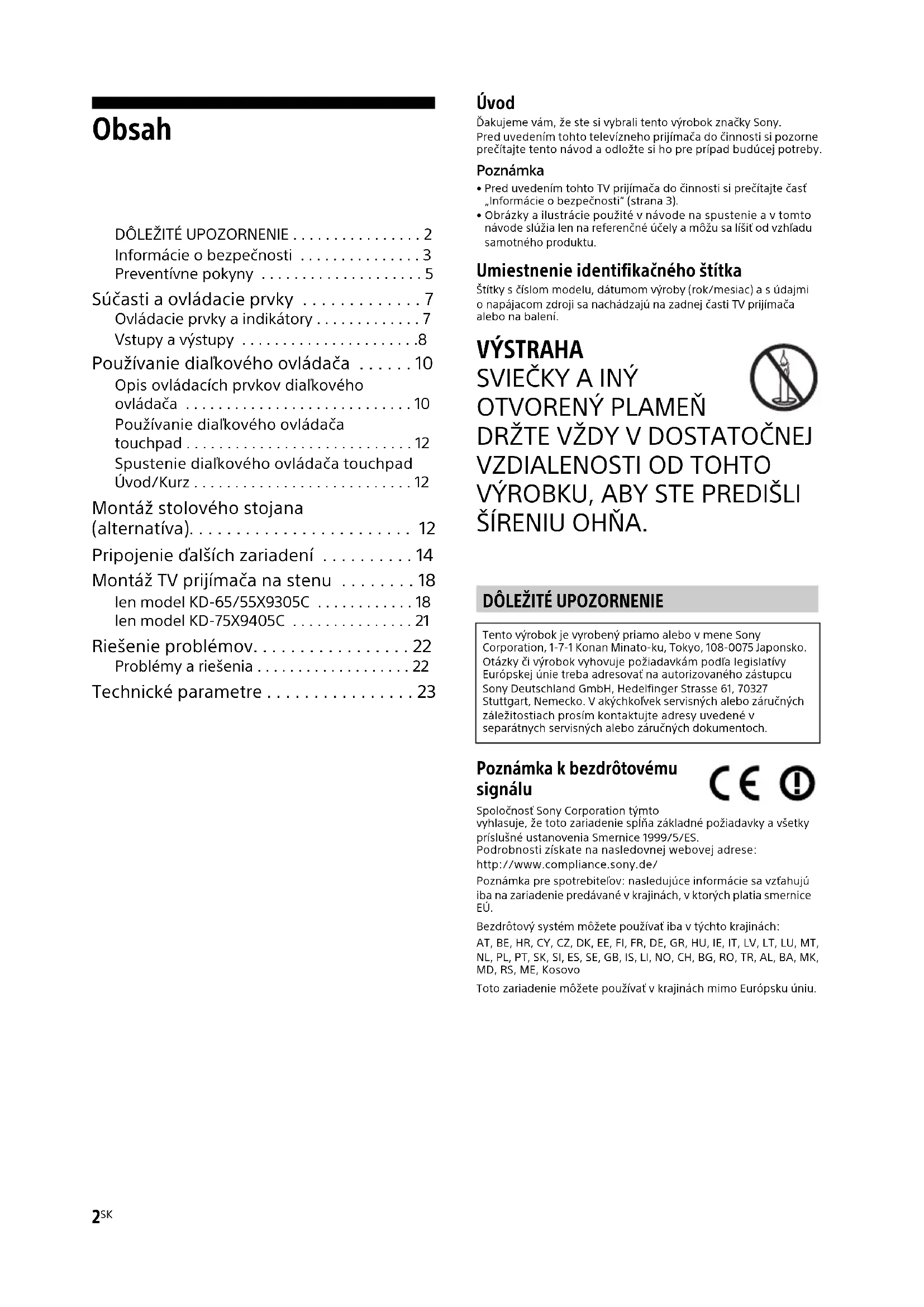 - Technické parametre Úvod Ďakujeme vám, že ste si vybrali tento výrobok značky Sony. Pred uvedením tohto televízneho prijímača do činnosti si pozorne prečítajte tento návod a odložte si ho pre prípad budúcej potreby.Poznámka• Pred uvedením tohto TV prijímača do činnosti si prečítajte časť „Informácie o bezpečnosti“ (strana 3). • Obrázky a ilustrácie použité v návode na spustenie a v tomto návode slúžia len na referenčné účely a môžu sa líšiť od vzhľadu samotného produktu. Umiestnenie identifikačného štítka Štítky s číslom modelu, dátumom výroby (rok/mesiac) a s údajmi o napájacom zdroji sa nachádzajú na zadnej časti TV prijímača alebo na balení. VÝSTRAHA p. 23