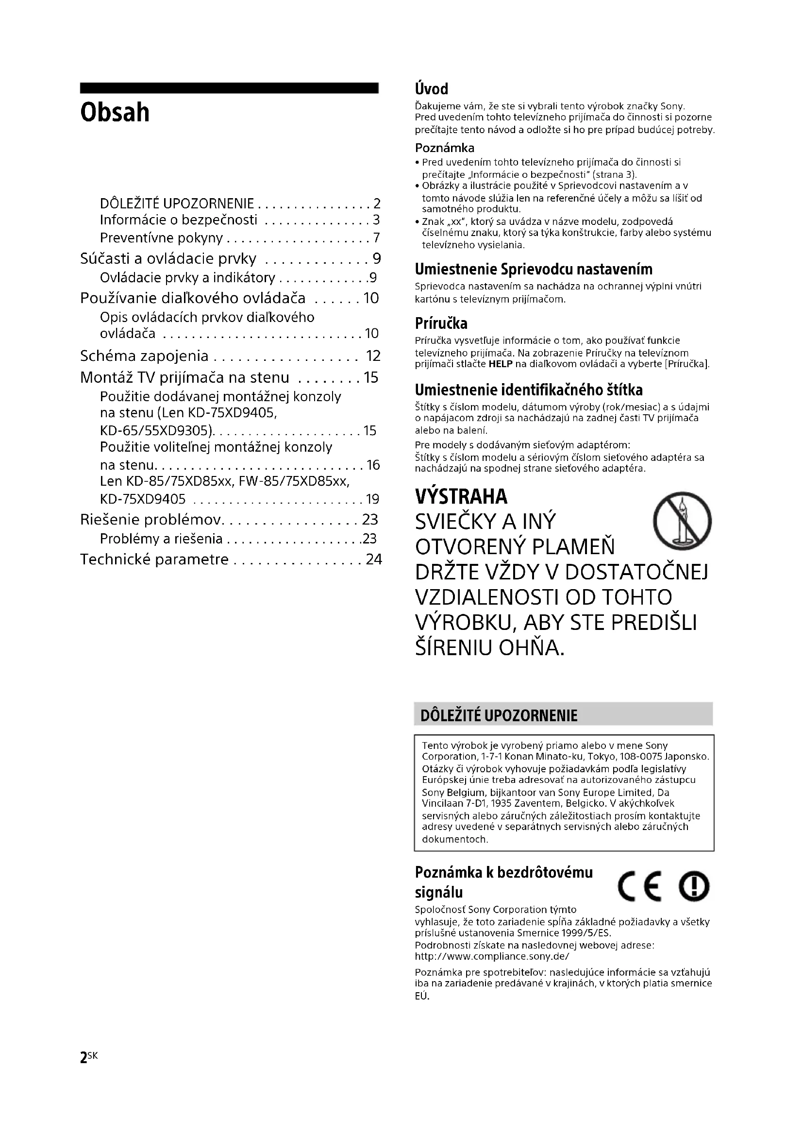D:\_SONY TV\SY150217_QH 85 EU RG\4584644151\14_4584644151_SK\010COVTOC_SK.fm masterpage: Right KD-85XD85xx / 75XD9405 / 75XD85xx / 65XD9305 / 65XD85xx / 55XD9305 / 55XD85xx / FW-85XD85xx / 75XD85xx / 65XD85xx / 55XD85xx 4-584-644-15(1) Bezdrôtový systém môžete používať iba v týchto krajinách: AT, BE, HR, CY, CZ, DK, EE, FI, FR, DE, GR, HU, IE, IT, LV, LT, LU, MT, NL, PL, PT, SK, SI, ES, SE, GB, IS, LI, NO, CH, BG, RO, TR, AL, BA, MK, MD, RS, ME, Kosovo Toto zariadenie môžete používať v krajinách mimo Európsku úniu. VAROVANIE Batérie nesmú byť vystavené nadmernému teplu, napríklad slnečnému svetlu, ohňu a podobne. Televízny prijímač nikdy neumiestňujte na nestabilné miesto. Televízny prijímač môže spadnúť a spôsobiť zranenie alebo smrť. Mnohým zraneniam, najmä u detí, sa dá zabrániť uplatnením jednoduchých opatrení, napríklad: Používať skrinky alebo stolíky odporúčané výrobcom televízneho prijímača. Používať len taký nábytok, na ktorom môže televízny prijímač bezpečne stáť. Zabezpečiť, aby televízny prijímač neprečnieval cez okraj nábytku, na ktorom stojí. Nedávať televízny prijímač na vysoký nábytok (napríklad na príborník či knižnicu) bez ukotvenia nábytku aj televízneho prijímača k vhodnej podpore. Nedávať televízny prijímač na látku či iné materiály, ktoré môžu byť medzi televíznym prijímačom a nábytkom. Poučiť deti o nebezpečenstvách šplhania sa po nábytku pri dosahovaní na televízny prijímač alebo jeho ovládacie prvky. Ak si ponechávate a premiestnite svoj pôvodný televízny prijímač, treba uplatňovať rovnaké opatrenia. Inštalácia/Nastavenie Televízny prijímač nainštalujte a používajte v súlade s dolu uvedenými pokynmi, aby ste predišli vzniku rizika požiaru, úderu elektrického prúdu, poškodeniam alebo úrazom. Inštalácia