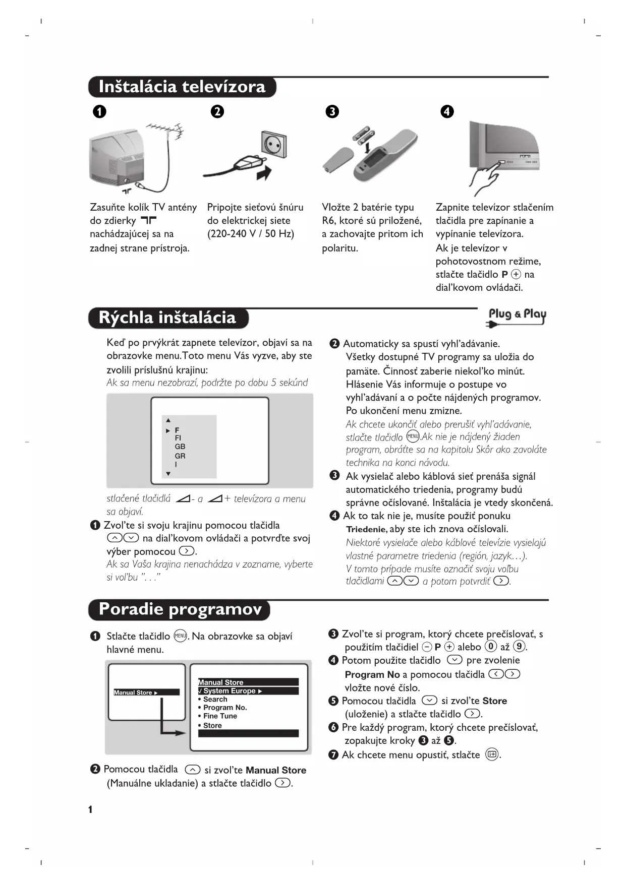 nachádzajúcej sa na zadnej strane prístroja. Pripojte sieťovú šnúru do elektrickej siete (220-240 V / 50 Hz) Vložte 2 batérie typu R6, ktoré sú priložené, a zachovajte pritom ich polaritu. Zapnite televízor stlačením tlačidla pre zapínanie a vypínanie televízora. Ak je televízor v pohotovostnom režime, stlačte tlačidlo P # na dial’kovom ovládači. æÂê® Rýchla inštalácia Poradie programov Keď po prvýkrát zapnete televízor, objaví sa na obrazovke menu.Toto menu Vás vyzve, aby ste zvolili príslušnú krajinu: Ak sa menu nezobrazí, podržte po dobu 5 sekúnd stlačené tlačidlá ”- a ”+ televízora a menu sa objaví. & Zvol’te si svoju krajinu pomocou tlačidla îÏ na dial’kovom ovládači a potvrďte svoj výber pomocou