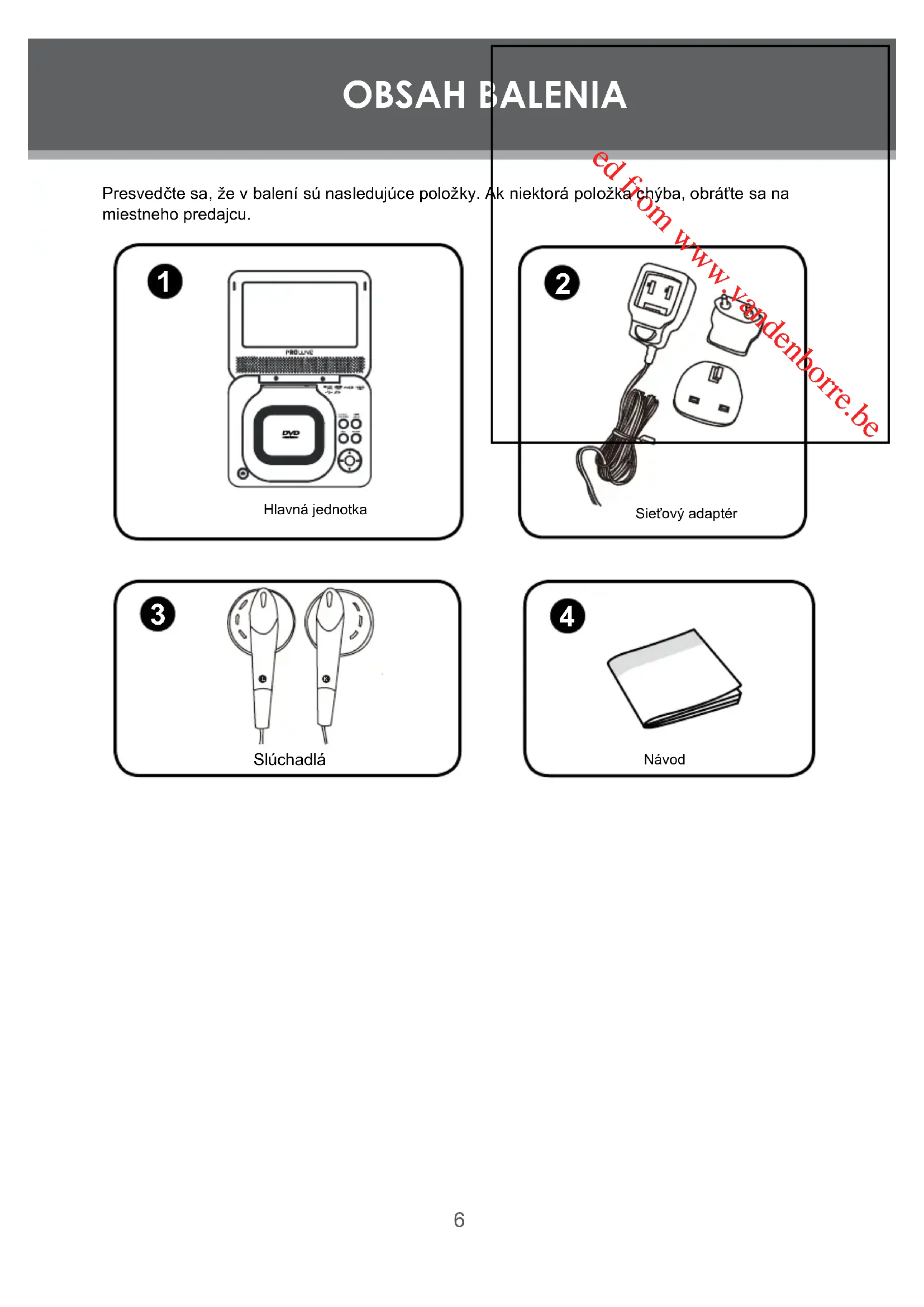 SKDownloaded from www.vandenborre.beDownloaded from www.vandenborre.be Napájanie Toto zariadenie je určené na prevádzku pri napájaní zo siete 100-240 V~, 50/60Hz. V prípade pripojenia prístroja na iný zdroj môže dôjsť k jeho poškodeniu. Pred prvým zapojením skontrolujte, či štítok (na sieťovom adaptéri) uvádza 100-240V AC. Sieťový adaptér Sieťový adaptér je pripojiteľný do štandardnej elektrickej zásuvky. VAROVANIE: Externý ohybný kábel alebo kábel tohto transformátora nemôže byť vymenený. Ak je kábel poškodený, transformátor musí byť vyradený. Symbol Tento prístroj je chránený Vnútri prístroja je nebezpečné dvojitou izoláciou a uzemnenie preto nie je nutné. napätie, ktoré môže spôsobiť úraz elektrickým prúdom. Táto značka označuje, že Prístroj sa dodáva s prístroj vyhovuje európskym používateľskou príručkou, v ktorej bezpečnostným normám a lsú uvedené dôležité pokyny na jeho prevádzku a údržbu.normám pre elektromagnetickú kompatibilitu (EMC). Laserový produkt Triedy 1 Výrobok obsahuje nízkoenergetické laserové zariadenie. Pri otvorení a vypnutí bezpečnostného mechanizmu vydáva prístroj neviditeľné laserové žiarenie. Vyhnite sa ožiareniu laserovým lúčom.Nikdy sa nepozerajte priamo do laserového lúča. Tento produkt má zabudovanú technológiu na ochranu autorských práv, ktorá zabraňuje kopírovaniu DVD disku na akékoľvek médium..Ak je videorekordér pripojený na prehrávač, bude výstupný video obraz skreslený počas nahrávania.Dlhodobé počúvanie prístroja pri maximálnej hlasitosti môže spôsobiť poškodenie sluchu používateľa. VAROVANIE : Je dôležité, aby slúchadlá používané s týmto výrobkom spĺňali ustanovenia francúzskeho nariadenia zo dňa 8. novembra 2005, ktoré zavádza článok L.5232-1. Tak zaistíte, že hladina zvuku nepresiahne 100 dB. Dlhodobé počúvanie pri vysokej hlasitosti, presahujúce päť hodín týždenne, môže poškodiť váš sluch.