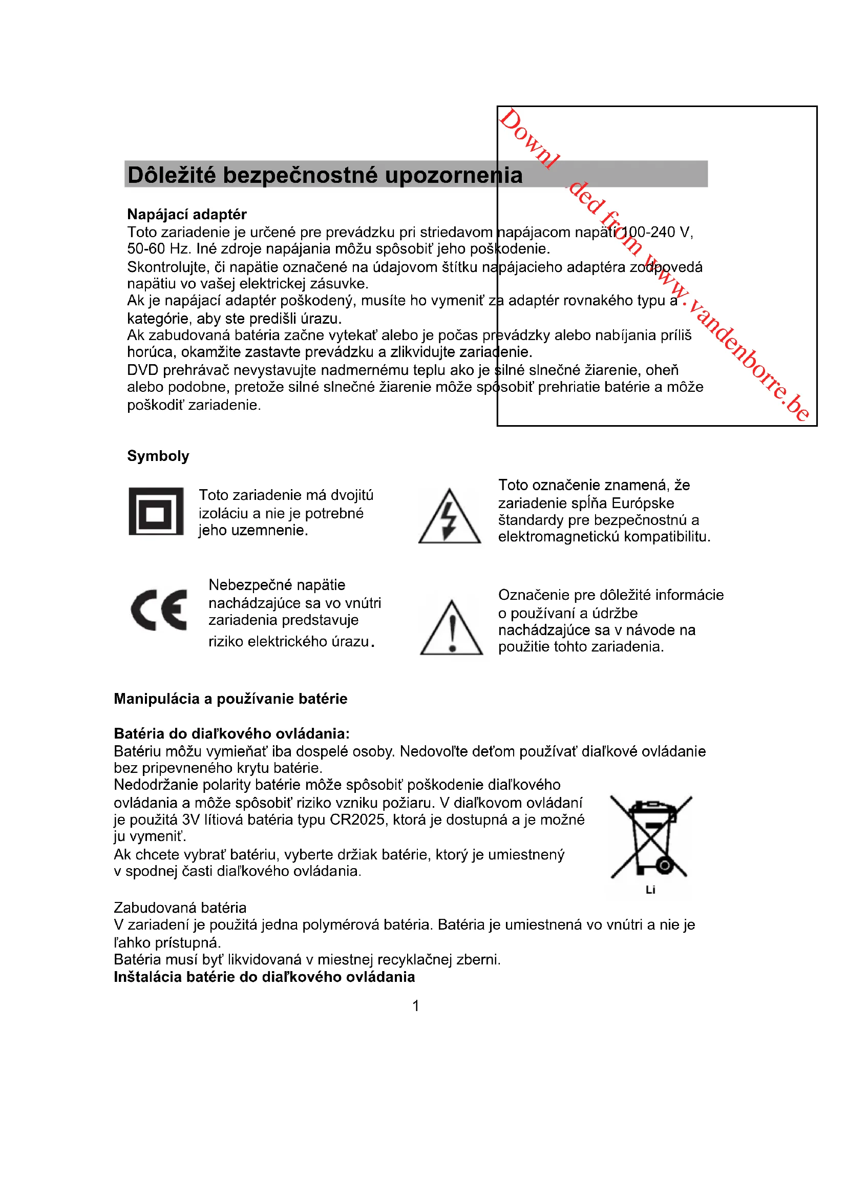 Zabudovaná batéria V zariadení je použitá jedna polymérová batéria. Batéria je umiestnená vo vnútri a nie je ľahko prístupná. Batéria musí byť likvidovaná v miestnej recyklačnej zberni. Inštalácia batérie do diaľkového ovládania Toto zariadenie má dvojitú izoláciu a nie je potrebné jeho uzemnenie. Toto označenie znamená, že zariadenie spĺňa Európske štandardy pre bezpečnostnú a elektromagnetickú kompatibilitu. Nebezpečné napätie nachádzajúce sa vo vnútri zariadenia predstavuje riziko elektrického úrazu