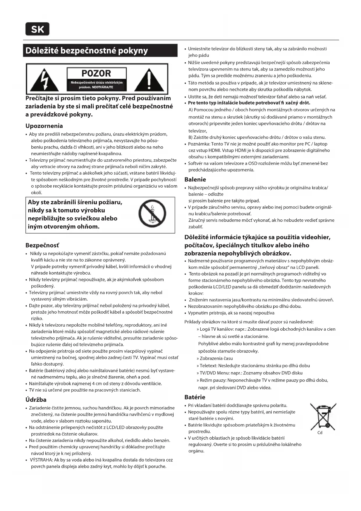 - Tento televízny prijímač aakékoľvek jeho súčasti, vrátane batérií likviduj- te spôsobom neškodným pre životné prostredie. Vprípade pochybností ospôsobe recyklácie kontaktujte prosím príslušnú organizáciu vo vašom okolí. Aby ste zabránili šíreniu požiaru, nikdy sa ktomuto výrobku nepribližujte so sviečkou alebo iným otvoreným ohňom. Bezpečnosť