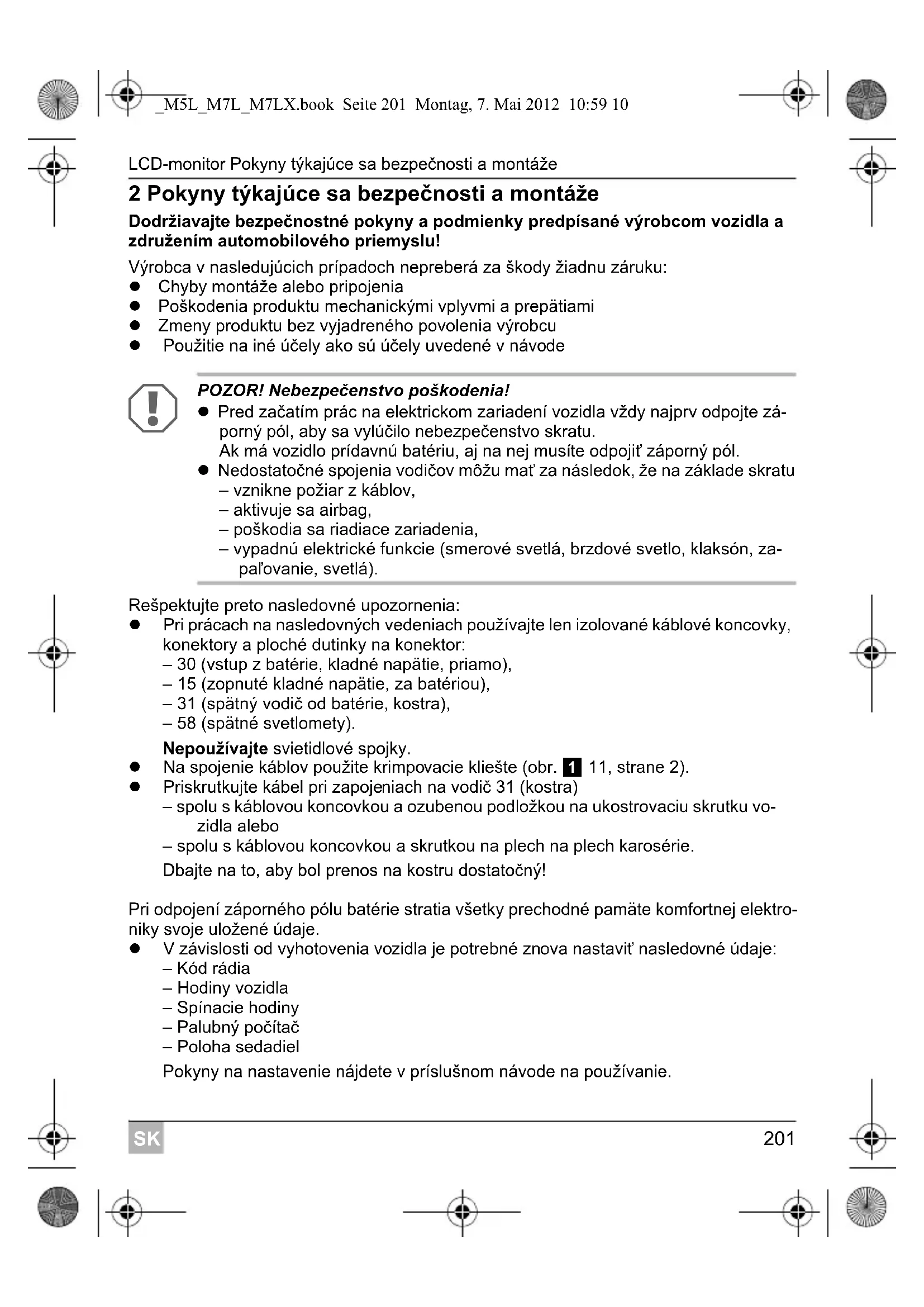 POZOR! Nebezpečenstvo poškodenia! Pred začatím prác na elektrickom zariadení vozidla vždy najprv odpojte zá- porný pól, aby sa vylúčilo nebezpečenstvo skratu. Ak má vozidlo prídavnú batériu, aj na nej musíte odpojiť záporný pól. Nedostatočné spojenia vodičov môžu mať za následok, že na základe skratu – vznikne požiar z káblov, – aktivuje sa airbag, – poškodia sa riadiace zariadenia, – vypadnú elektrické funkcie (smerové svetlá, brzdové svetlo, klaksón, za- paľovanie, svetlá). Rešpektujte preto nasledovné upozornenia: Pri prácach na nasledovných vedeniach používajte len izolované káblové koncovky, konektory a ploché dutinky na konektor: – 30 (vstup z batérie, kladné napätie, priamo), – 15 (zopnuté kladné napätie, za batériou), – 31 (spätný vodič od batérie, kostra), – 58 (spätné svetlomety). Nepoužívajte svietidlové spojky. Na spojenie káblov použite krimpovacie kliešte (obr. 1 11, strane 2). Priskrutkujte kábel pri zapojeniach na vodič 31 (kostra) – spolu s káblovou koncovkou a ozubenou podložkou na ukostrovaciu skrutku vo- zidla alebo – spolu s káblovou koncovkou a skrutkou na plech na plech karosérie. Dbajte na to, aby bol prenos na kostru dostatočný! Pri odpojení záporného pólu batérie stratia všetky prechodné pamäte komfortnej elektro- niky svoje uložené údaje. V závislosti od vyhotovenia vozidla je potrebné znova nastaviť nasledovné údaje: – Kód rádia – Hodiny vozidla – Spínacie hodiny – Palubný počítač – Poloha sedadiel Pokyny na nastavenie nájdete v príslušnom návode na používanie. _M5L_M7L_M7LX.book Seite 201 Montag, 7. Mai 2012 10:59 10Pokyny týkajúce sa bezpečnosti a montáže LCD-monitor