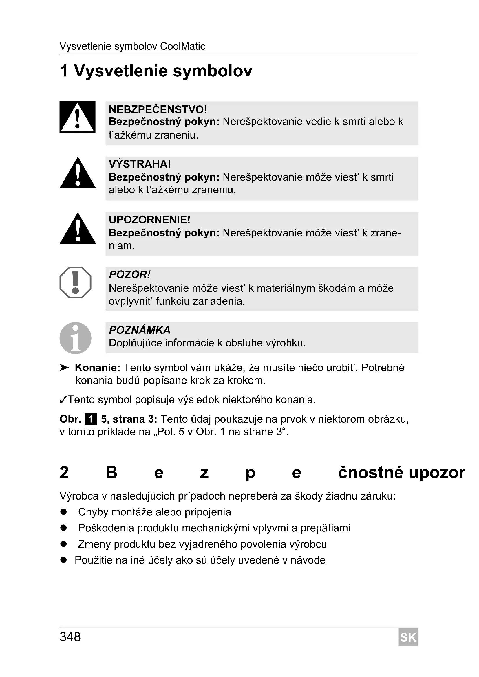 ➤ Konanie: Tento symbol vám ukáže, že musíte niečo urobit’. Potrebné konania budú popísane krok za krokom. ✓ Tento symbol popisuje výsledok niektorého konania. Obr. 1 5, strana 3: Tento údaj poukazuje na prvok v niektorom obrázku, v tomto príklade na „Pol. 5 v Obr. 1 na strane 3“. 2Bezpečnostné upozornenia Výrobca v nasledujúcich prípadoch nepreberá za škody žiadnu záruku: Chyby montáže alebo pripojenia Poškodenia produktu mechanickými vplyvmi a prepätiami Zmeny produktu bez vyjadreného povolenia výrobcu Použitie na iné účely ako sú účely uvedené v návode NEBZPEČENSTVO! Bezpečnostný pokyn: Nerešpektovanie vedie k smrti alebo k t’ažkému zraneniu. VÝSTRAHA! Bezpečnostný pokyn: Nerešpektovanie môže viest’ k smrti alebo k t’ažkému zraneniu. UPOZORNENIE! Bezpečnostný pokyn: Nerešpektovanie môže viest’ k zrane- niam. POZOR! Nerešpektovanie môže viest’ k materiálnym škodám a môže ovplyvnit’ funkciu zariadenia. POZNÁMKA Doplňujúce informácie k obsluhe výrobku.SK CoolMatic Bezpečnostné upozornenia