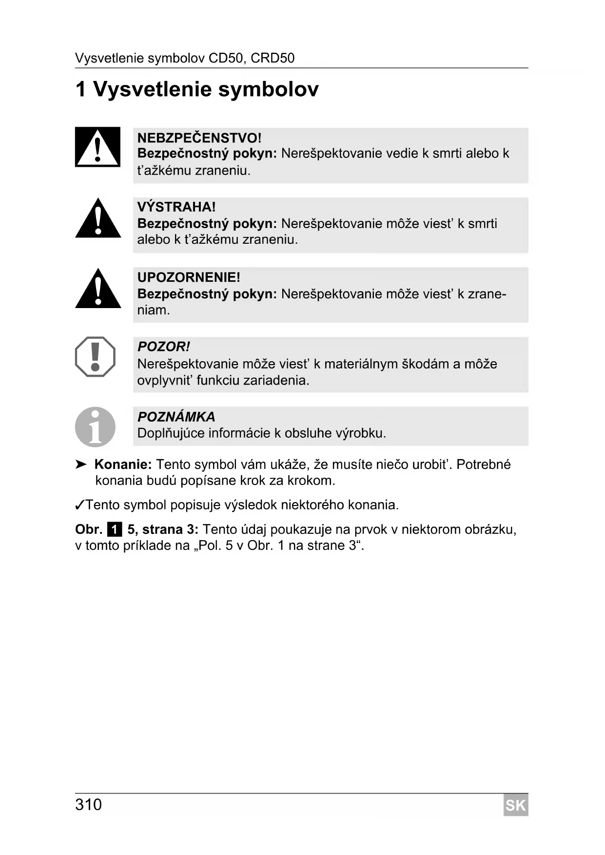➤ Konanie: Tento symbol vám ukáže, že musíte niečo urobit’. Potrebné konania budú popísane krok za krokom. ✓ Tento symbol popisuje výsledok niektorého konania. Obr. 1 5, strana 3: Tento údaj poukazuje na prvok v niektorom obrázku, v tomto príklade na „Pol. 5 v Obr. 1 na strane 3“. NEBZPEČENSTVO! Bezpečnostný pokyn: Nerešpektovanie vedie k smrti alebo k t’ažkému zraneniu. VÝSTRAHA! Bezpečnostný pokyn: Nerešpektovanie môže viest’ k smrti alebo k t’ažkému zraneniu. UPOZORNENIE! Bezpečnostný pokyn: Nerešpektovanie môže viest’ k zrane- niam. POZOR! Nerešpektovanie môže viest’ k materiálnym škodám a môže ovplyvnit’ funkciu zariadenia. POZNÁMKA Doplňujúce informácie k obsluhe výrobku.SK CD50, CRD50 Bezpečnostné pokyny