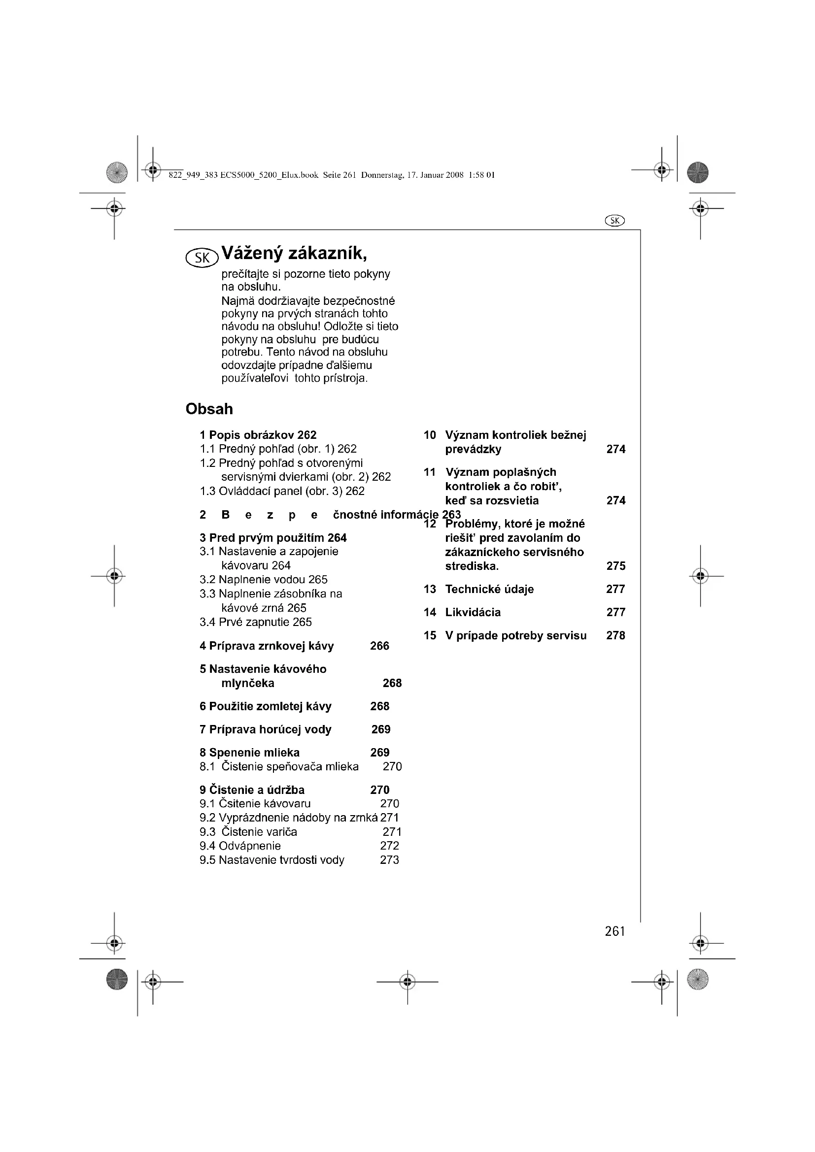 9.4 Odvápnenie 2729.5 Nastavenie tvrdosti vody 27310 Význam kontroliek bežnej prevádzky 27411 Význam poplašných kontroliek a čo robit’, keď sa rozsvietia 27412 Problémy, ktoré je možné riešit’ pred zavolaním do zákazníckeho servisného strediska. 27513 Technické údaje 27714 Likvidácia 27715 V prípade potreby servisu 278822_949_383 ECS5000_5200_Elux.book Seite 261 Donnerstag, 17. Januar 2008 1:58 01v
