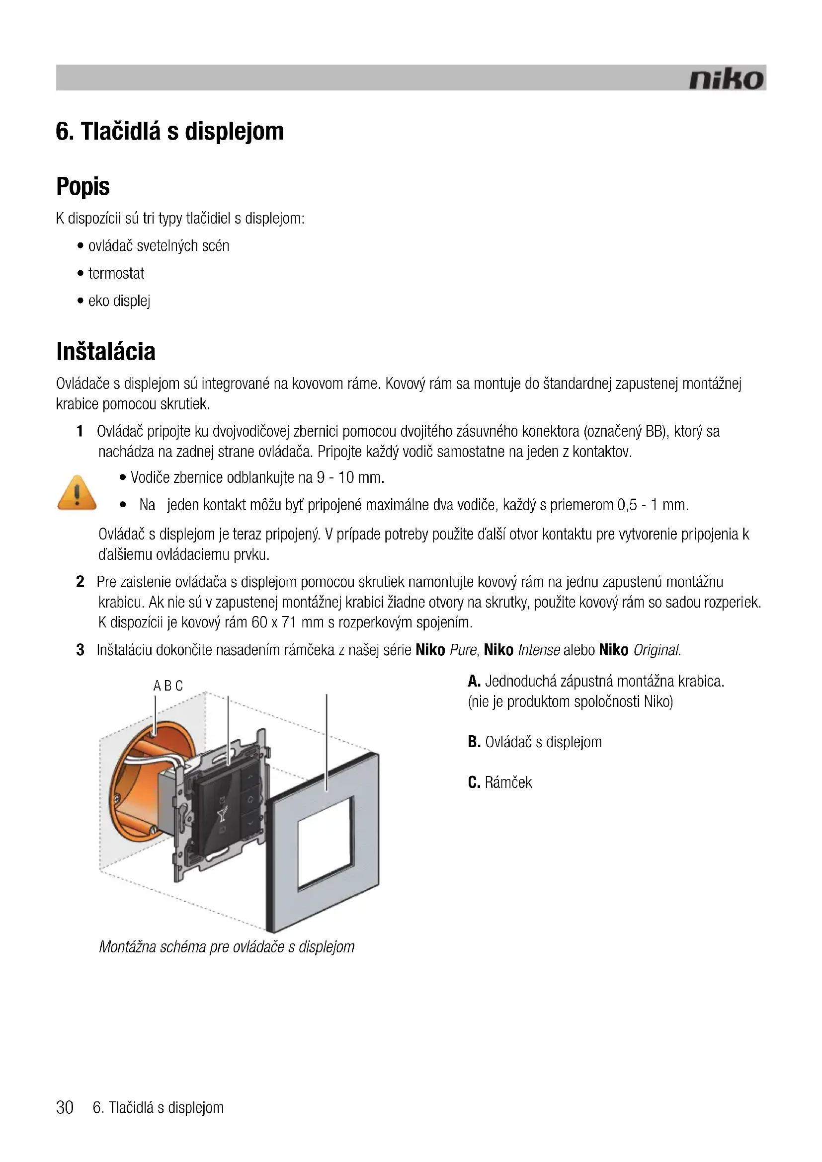 - eko displej Inštalácia Ovládače s displejom sú integrované na kovovom ráme. Kovový rám sa montuje do štandardnej zapustenej montážnej krabice pomocou skrutiek. 1 Ovládač pripojte ku dvojvodičovej zbernici pomocou dvojitého zásuvného konektora (označený BB), ktorý sa nachádza na zadnej strane ovládača. Pripojte každý vodič samostatne na jeden z kontaktov. Ovládač s displejom je teraz pripojený. V prípade potreby použite ďalší otvor kontaktu pre vytvorenie pripojenia k ďalšiemu ovládaciemu prvku. 2 Pre zaistenie ovládača s displejom pomocou skrutiek namontujte kovový rám na jednu zapustenú montážnu krabicu. Ak nie sú v zapustenej montážnej krabici žiadne otvory na skrutky, použite kovový rám so sadou rozperiek. K dispozícii je kovový rám 60 x 71 mm s rozperkovým spojením. 3 Inštaláciu dokončite nasadením rámčeka z našej série Niko Pure, Niko Intense alebo Niko Original.