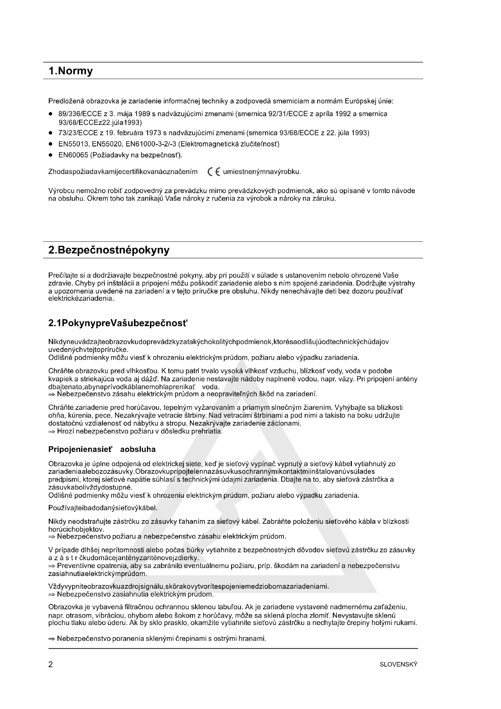 Predložená obrazovka je zariadenie informačnej techniky a zodpovedá smerniciam a normám Európskej únie: D 89/336/ECCE z 3. mája 1989 s nadväzujúcimi zmenami (smernica 92/31/ECCE z apríla 1992 a smernica 93/68/ECCE z 22. júla 1993) D 73/23/ECCE z 19. februára 1973 s nadväzujúcimi zmenami (smernica 93/68/ECCE z 22. júla 1993) D EN55013, EN55020, EN61000-3-2/-3 (Elektromagnetická zlučiteľnosť) D EN60065 (Požiadavky na bezpečnos ť). Zhoda s požiadavkami je certifikovaná označením umiestneným na výrobku. Výrobcu nemožno robiť zodpovedný za prevádzku mimo prevádzkových podmienok, ako sú opísané v tomto návode na obsluhu. Okrem toho tak zanikajú Vaše nároky z ručenia za výrobok a nároky na záruku.