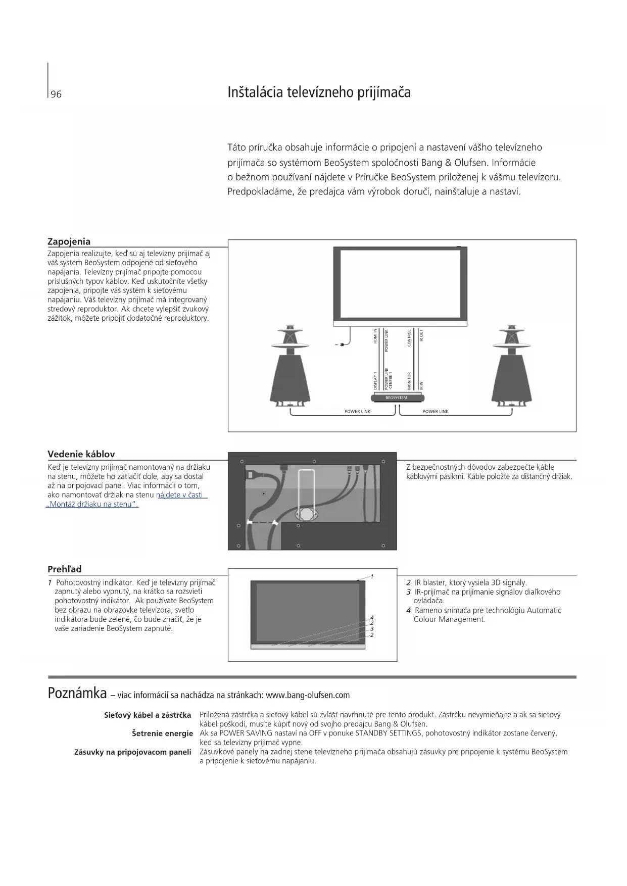 4Poznámka – viac informácií sa nachádza na stránkach: www.bang-olufsen.com Sieťový kábel a zástrčka Šetrenie energie Zásuvky na pripojovacom paneli Priložená zástrčka asieťový kábel sú zvlášť navrhnuté pre tento produkt. Zástrčku nevymieňajte aak sa sieťový kábel poškodí, musíte kúpiť nový od svojho predajcu Bang&Olufsen. Ak sa POWER SAVING nastaví na OFF v ponuke STANDBY SETTINGS, pohotovostný indikátor zostane červený, keď sa televízny prijímač vypne. Zásuvkové panely na zadnej stene televízneho prijímača obsahujú zásuvky pre pripojenie k systému BeoSystem a pripojenie k sieťovému napájaniu. Inštalácia televízneho prijímača Táto príručka obsahuje informácie o pripojení a nastavení vášho televízneho prijímača so systémom BeoSystem spoločnosti Bang & Olufsen. Informácie obežnom používaní nájdete vPríručke BeoSystem priloženej k vášmu televízoru. Predpokladáme, že predajca vám výrobok doručí, nainštaluje a nastaví. Vedenie káblov Keď je televízny prijímač namontovaný na držiaku na stenu, môžete ho zatlačiť dole, aby sa dostal až na pripojovací panel. Viac informácií o tom, ako namontovať držiak na stenu nájdete v časti „Montáž držiaku na stenu“. Zapojenia Zapojenia realizujte, keď sú aj televízny prijímač aj váš systém BeoSystem odpojené od sieťového napájania. Televízny prijímač pripojte pomocou príslušných typov káblov. Keď uskutočníte všetky zapojenia, pripojte váš systém k sieťovému napájaniu. Váš televízny prijímač má integrovaný stredový reproduktor. Ak chcete vylepšiť zvukový zážitok, môžete pripojiť dodatočné reproduktory. Prehľad 1 Pohotovostný indikátor. Keď je televízny prijímač zapnutý alebo vypnutý, na krátko sa rozsvieti pohotovostný indikátor. Ak používate BeoSystem bez obrazu na obrazovke televízora, svetlo indikátora bude zelené, čo bude značiť, že je vaše zariadenie BeoSystem zapnuté. 2 IR blaster, ktorý vysiela 3D signály. 3 IR-prijímač na prijímanie signálov diaľkového ovládača. 4 Rameno snímača pre technológiu Automatic Colour Management. Z bezpečnostných dôvodov zabezpečte káble káblovými pásikmi. Káble položte za dištančný držiak.