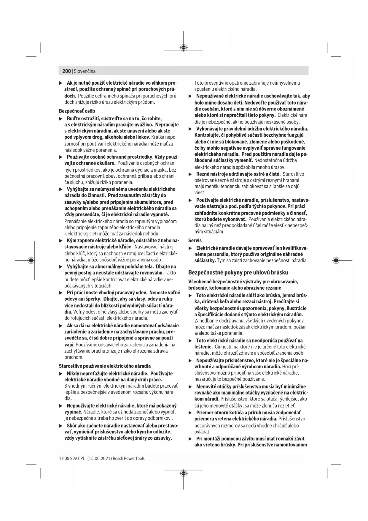 Uvedené hodnoty stupně otáček jsou orientační hodnoty. u Jmenovité otáčky příslušenství se musí minimálně rovnat maximálním otáčkám uvedeným na elektrickém nářadí. Příslušenství používané pro vyšší než jejich jmenovité otáčky může prasknout arozpadnout se. Pracovní pokyny u Před každou prací na elektronářadí vytáhněte zástrčku ze zásuvky. u Pozor při řezání drážek do nosných zdí, viz část „Upozornění ke statice“. u Obrobek upněte, pokud neleží bezpečně působením vlastní hmotnosti. u Nezatěžujte elektronářadí natolik, aby se zastavilo. u Po velkém zatížení nechte elektronářadí ještě několik minut běžet naprázdno, aby nástroj vychladl. u Elektronářadí nepoužívejte sdělicím brusným stojanem. u Nedotýkejte se brusných arozbrušovacích kotoučů, dokud nevychladnou. Kotouče se při práci silně zahřívají. Vějířový brusný kotouč Svějířovým brusným kotoučem (příslušenství) můžete brousit iklenuté povrchy aprofily. Vějířové brusné kotouče mají podstatně delší životnost, jsou méně hlučné améně se při broušení zahřívají než běžné brusné kotouče. Hrubování u Nikdy nepoužívejte dělicí kotouče khrubování. Nejlepšího pracovního výsledku při hrubování dosáhnete při úhlu nastavení 30° až 40°. Pohybujte elektronářadím smírným přítlakem sem atam. Obrobek se tak příliš nezahřeje, nezabarví se anevzniknou rýhy. Rozbrušování kovu u Při dělení sbrusivem spojivem používejte vždy ochranný kryt pro dělení (6). Při rozbrušování pracujte smírným posuvem přizpůsobeným řezanému materiálu. Na robzrušovací kotouč netlačte, nenatáčejte ho do šikmé polohy anekmitejte sním. Dobíhající rozbrušovací kotouče nepřibrzďujte bočním protitlakem. Elektrické nářadí je nutné vést vždy protiběžně. Jinak hrozí nebezpečí, že dojde kjeho nekontrolovanému vytlačení zřezu. Při řezání profilů ačtyřhranných trubek je nejlepší nasadit nářadí vmístě nejmenšího průřezu. Dělení kamene u Při dělení kamene zajistěte dostatečné odsávání prachu. u Noste ochrannou masku proti prachu. u Elektronářadí se smí používat pouze pro řezání/ broušení za sucha. Pro dělení kamene používejte nejlépe diamantový dělicí kotouč. Při použití odsávacího krytu pro dělení svodicími saněmi (18) musí být vysavač schválený pro odsávání kamenného prachu. Firma Bosch nabízí vhodné vysavače. Zapněte elektronářadí anasaďte ho přední částí vodicích saní na obrobek. Posunujte elektronářadí smírným posuvem přizpůsobeným obráběnému materiálu. Při dělení mimořádně tvrdých materiálů, např. betonu svysokým podílem kameniva, se může diamantový dělicí kotouč přehřívat atím poškodit. Jasně na to ukazuje jiskření po obvodu diamantového dělicího kotouče. Vtakovém případě přerušte dělení anechte diamantový dělicí kotouč běžet naprázdno snejvyššími otáčkami, aby vychladl. Citelně se zpomalující postup práce ajiskření po obvodu kotouče jsou známkou ztupeného diamantového dělicího kotouče. Můžete ho znovu naostřit krátkými řezy do abrazivního materiálu, např. vápencového pískovce. Upozornění ke statice Na drážky do nosných zdí se vztahuje norma DIN1053 část1 nebo specifická ustanovení pro příslušné země. Tyto předpisy je bezpodmínečně nutné dodržovat. Před začátkem práce se poraďte sodpovědným statikem, architektem nebo příslušným stavbyvedoucím. 1 609 92A 6PL | (15.06.2021) Bosch Power ToolsSlovenčina | 199 Údržba aservis Údržba ačištění u Před každou prací na elektronářadí vytáhněte zástrčku ze zásuvky. u Udržujte elektronářadí avětrací otvory čisté, aby pracovalo dobře abezpečně. u Při použití vextrémních podmínkách používejte pokud možno vždy odsávací zařízení. Často vyfukujte větrací otvory apřed nářadí zapojte proudový chránič. Při řezání kovů se může uvnitř elektronářadí usazovat vodivý prach. To může negativně ovlivnit ochrannou izolaci elektronářadí. Příslušenství pečlivě ukládejte azacházejte sním opatrně. Je-li nutná výměna přívodního kabelu, nechte ji provést firmou Bosch nebo autorizovaným servisem pro elektronářadí Bosch, abyste zabránili ohrožení bezpečnosti. Zákaznická služba aporadenství ohledně použití Zákaznická služba zodpoví vaše dotazy kopravě aúdržbě vašeho výrobku atéž knáhradním dílům. Rozkladové výkresy ainformace onáhradních dílech najdete také na: www.bosch-pt.com Vpřípadě dotazů knašim výrobkům apříslušenství vám ochotně pomůže poradenský tým Bosch. Vpřípadě veškerých otázek aobjednávek náhradních dílů bezpodmínečně uveďte 10místné věcné číslo podle typového štítku výrobku. Czech Republic Robert Bosch odbytová s.r.o. Bosch Service Center PT K Vápence 1621/16 692 01 Mikulov Na www.bosch-pt.cz si si můžete objednat opravu Vašeho stroje nebo náhradní díly online. Tel.: +420 519 305700 Fax: +420 519 305705 E-Mail: servis.naradi@cz.bosch.com www.bosch-pt.cz Další adresy servisů najdete na: www.bosch-pt.com/serviceaddresses Likvidace Elektronářadí, příslušenství aobaly odevzdejte kekologické recyklaci. Elektronářadí nevyhazujte do domovního odpadu! Pouze pro zeměEU: Podle evropské směrnice 2012/19/EU oodpadních elektrických aelektronických zařízeních ajejí realizace vnárodních zákonech se již nepoužitelné elektronářadí musí shromažďovat odděleně od ostatního odpadu aodevzdat kekologické recyklaci. Slovenčina Bezpečnostné upozornenia Všeobecné bezpečnostné výstrahy – elektrické náradie VÝSTRAHA Prečítajte si všetky bezpečnostné výstrahy avšetky pokyny. Nedodr- žanie týchto vý