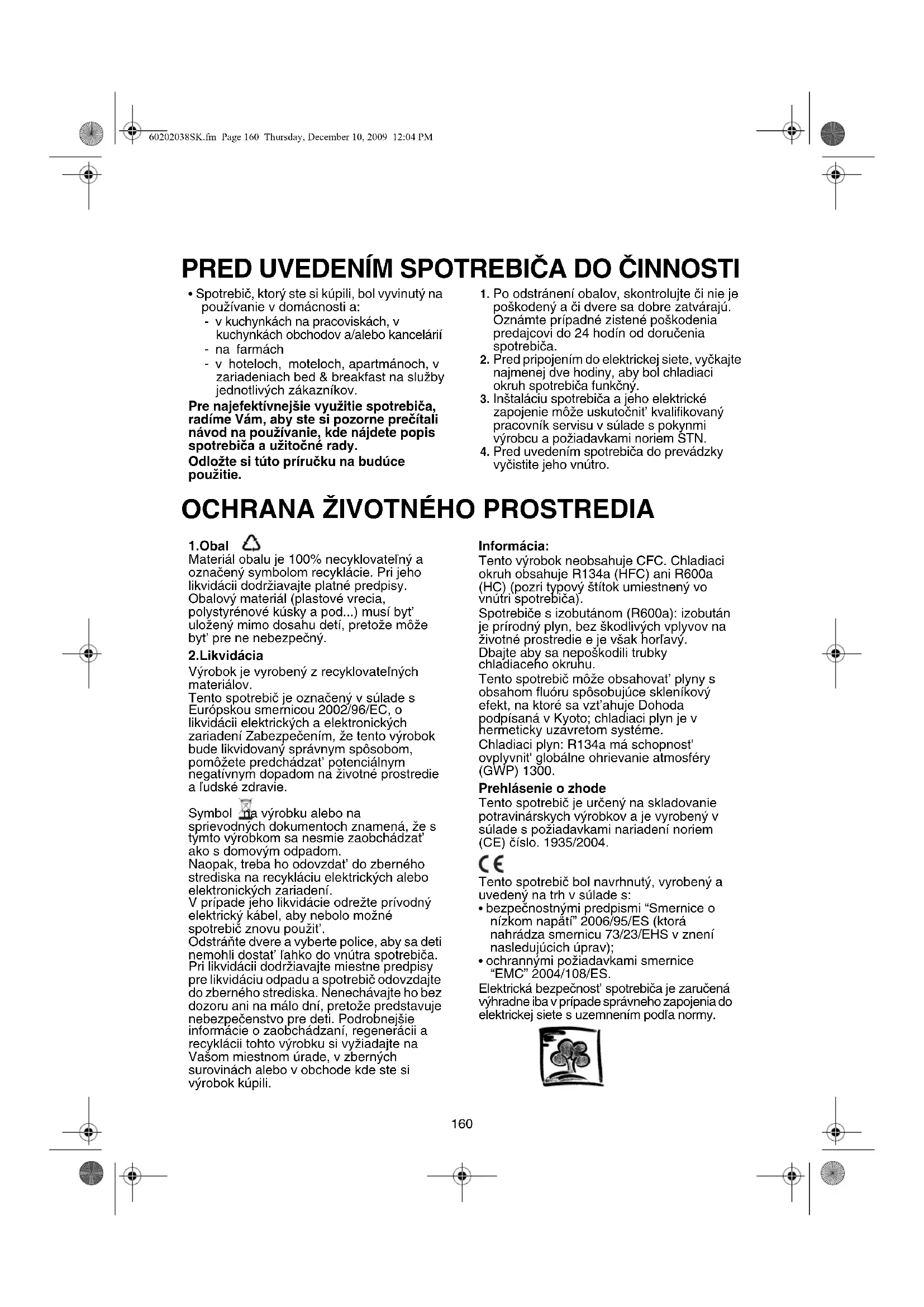 vyčistite jeho vnútro. 1.Obal Materiál obalu je 100% necyklovateľný a označený symbolom recyklácie. Pri jeho likvidácii dodržiavajte platné predpisy. Obalový materiál (plastové vrecia, polystyrénové kúsky a pod...) musí byt’ uložený mimo dosahu detí, pretože môže byt’ pre ne nebezpečný. 2.Likvidácia Výrobok je vyrobený z recyklovateľných materiálov. Tento spotrebič je označený v súlade s Európskou smernicou 2002/96/EC, o likvidácii elektrických a elektronických zariadení Zabezpečením, že tento výrobok bude likvidovaný správnym spôsobom, pomôžete predchádzat’ potenciálnym negatívnym dopadom na životné prostredie a ľudské zdravie. Symbol na výrobku alebo na sprievodných dokumentoch znamená, že s týmto výrobkom sa nesmie zaobchádzat’ ako s domovým odpadom. Naopak, treba ho odovzdat’ do zberného strediska na recykláciu elektrických alebo elektronických zariadení. V prípade jeho likvidácie odrežte prívodný elektrický kábel, aby nebolo možné spotrebič znovu použit’. Odstráňte dvere a vyberte police, aby sa deti nemohli dostat’ ľahko do vnútra spotrebiča. Pri likvidácii dodržiavajte miestne predpisy pre likvidáciu odpadu a spotrebič odovzdajte do zberného strediska. Nenechávajte ho bez dozoru ani na málo dní, pretože predstavuje nebezpečenstvo pre deti. Podrobnejšie informácie o zaobchádzaní, regenerácii a recyklácii tohto výrobku si vyžiadajte na Vašom miestnom úrade, v zberných surovinách alebo v obchode kde ste si výrobok kúpili. Informácia: Tento výrobok neobsahuje CFC. Chladiaci okruh obsahuje R134a (HFC) ani R600a (HC) (pozri typový štítok umiestnený vo vnútri spotrebiča). Spotrebiče s izobutánom (R600a): izobután je prírodný plyn, bez škodlivých vplyvov na životné prostredie e je však horľavý. Dbajte aby sa nepoškodili trubky chladiaceho okruhu. Tento spotrebič môže obsahovat’ plyny s obsahom fluóru spôsobujúce skleníkový efekt, na ktoré sa vzt’ahuje Dohoda podpísaná v Kyoto; chladiaci plyn je v hermeticky uzavretom systéme. Chladiaci plyn: R134a má schopnost' ovplyvnit' globálne ohrievanie atmosféry (GWP) 1300. Prehlásenie o zhode Tento spotrebič je určený na skladovanie potravinárskych výrobkov a je vyrobený v súlade s požiadavkami nariadení noriem (CE) číslo. 1935/2004. Tento spotrebič bol navrhnutý, vyrobený a uvedený na trh v súlade s: