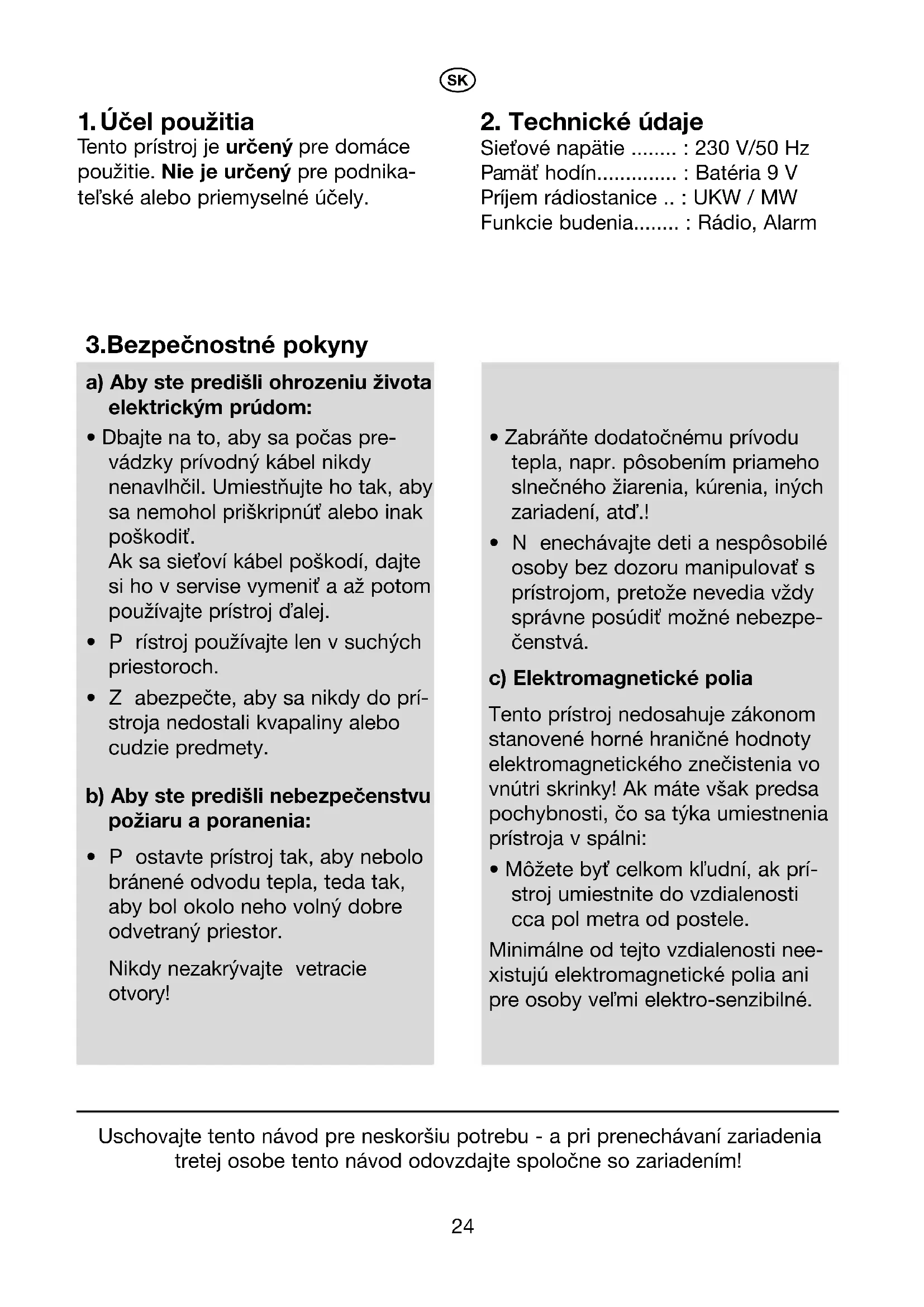 - Nenechávajte deti a nespôsobilé osoby bez dozoru manipulovať s prístrojom, pretože nevedia vždy správne posúdiť možné nebezpe- čenstvá. c) Elektromagnetické polia Tento prístroj nedosahuje zákonom stanovené horné hraničné hodnoty elektromagnetického znečistenia vo vnútri skrinky! Ak máte však predsa pochybnosti, čo sa týka umiestnenia prístroja v spálni: